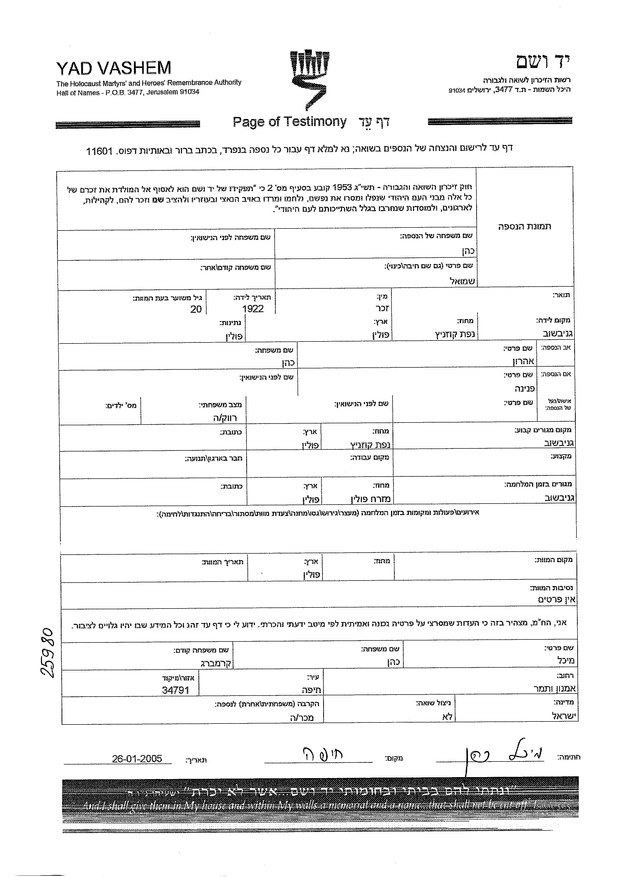 Shmuel Kohen wurde im Jahr 1922 in Gniewiszow, Polen geboren. Er war der Sohn von Aharon und Pnina. Er war Ledig. Vor dem Zweiten Weltkrieg lebte er in Gniewiszow, Polen. Während des Krieges war er in Gniewiszow, Polen.