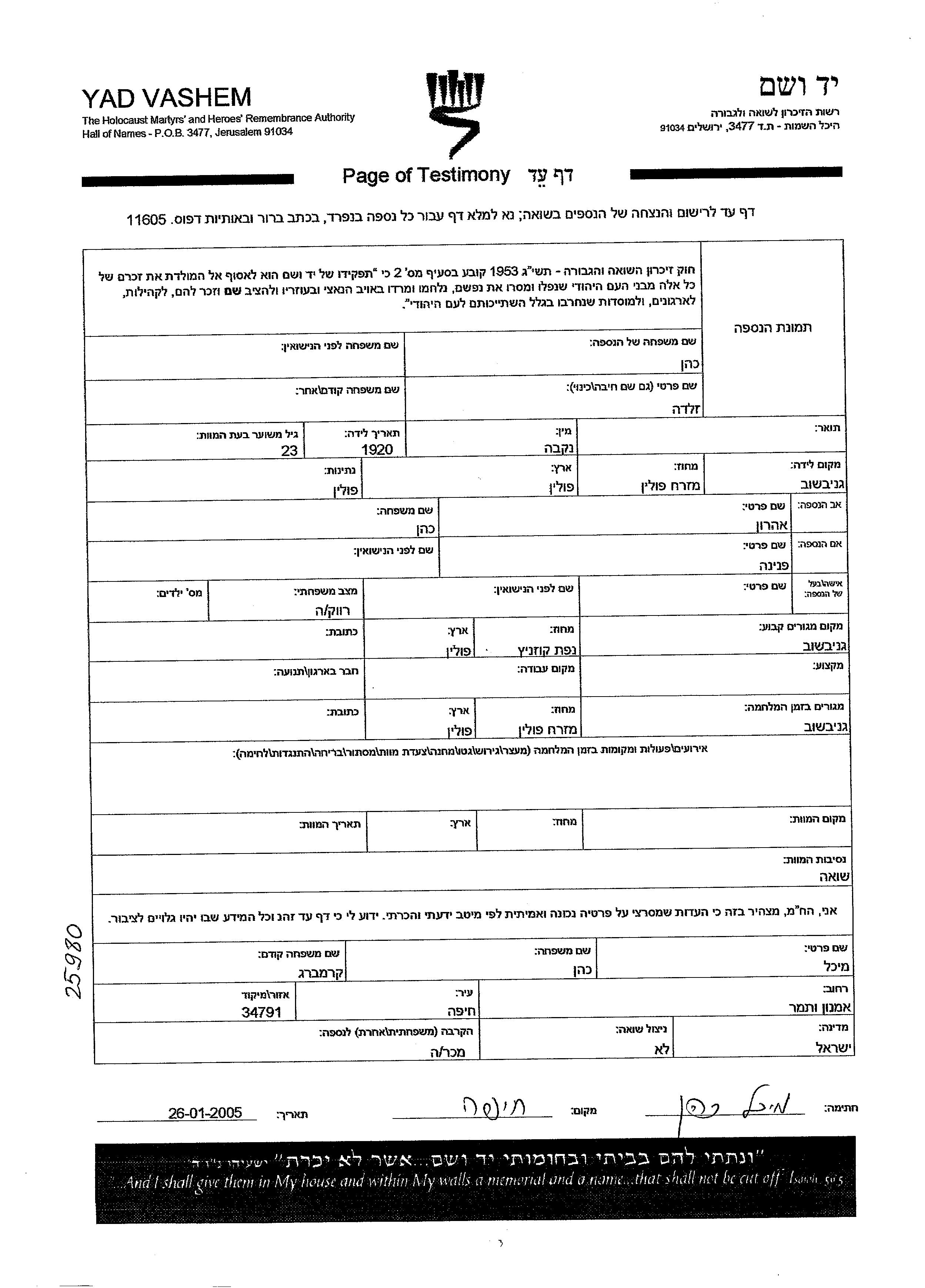 Zelda Kohen wurde im Jahr 1920 in Gniewoszow, Polen geboren. Sie war die Tochter von Aharon und Pnina. Sie war Ledig. Vor dem Zweiten Weltkrieg lebte sie in Gniewoszow, Polen. Während des Krieges war sie in Gniewoszow, Polen.