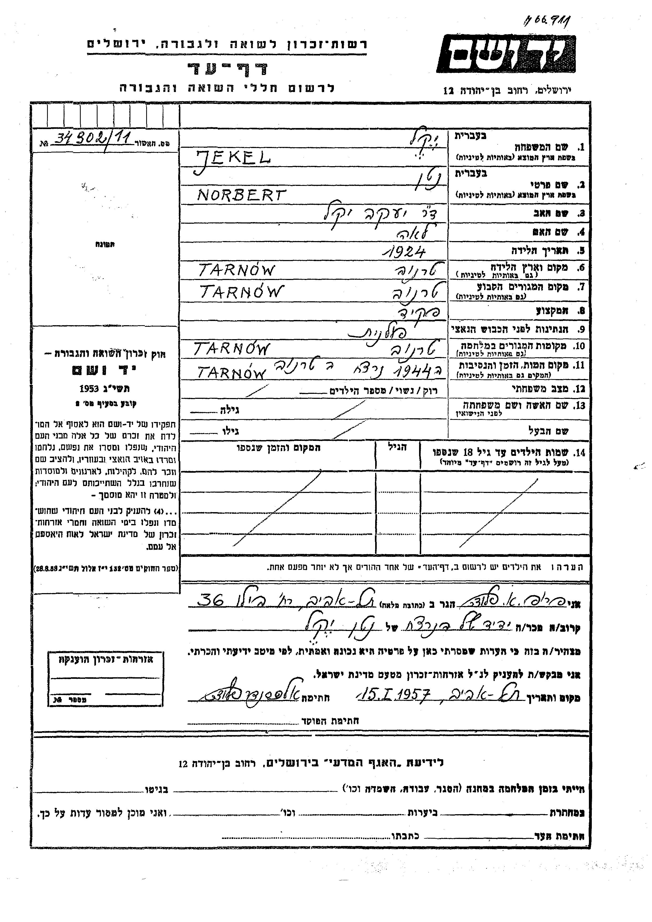 Jekel Natan Norbert 1924 Tarnow, Polen Gedenkblatt
