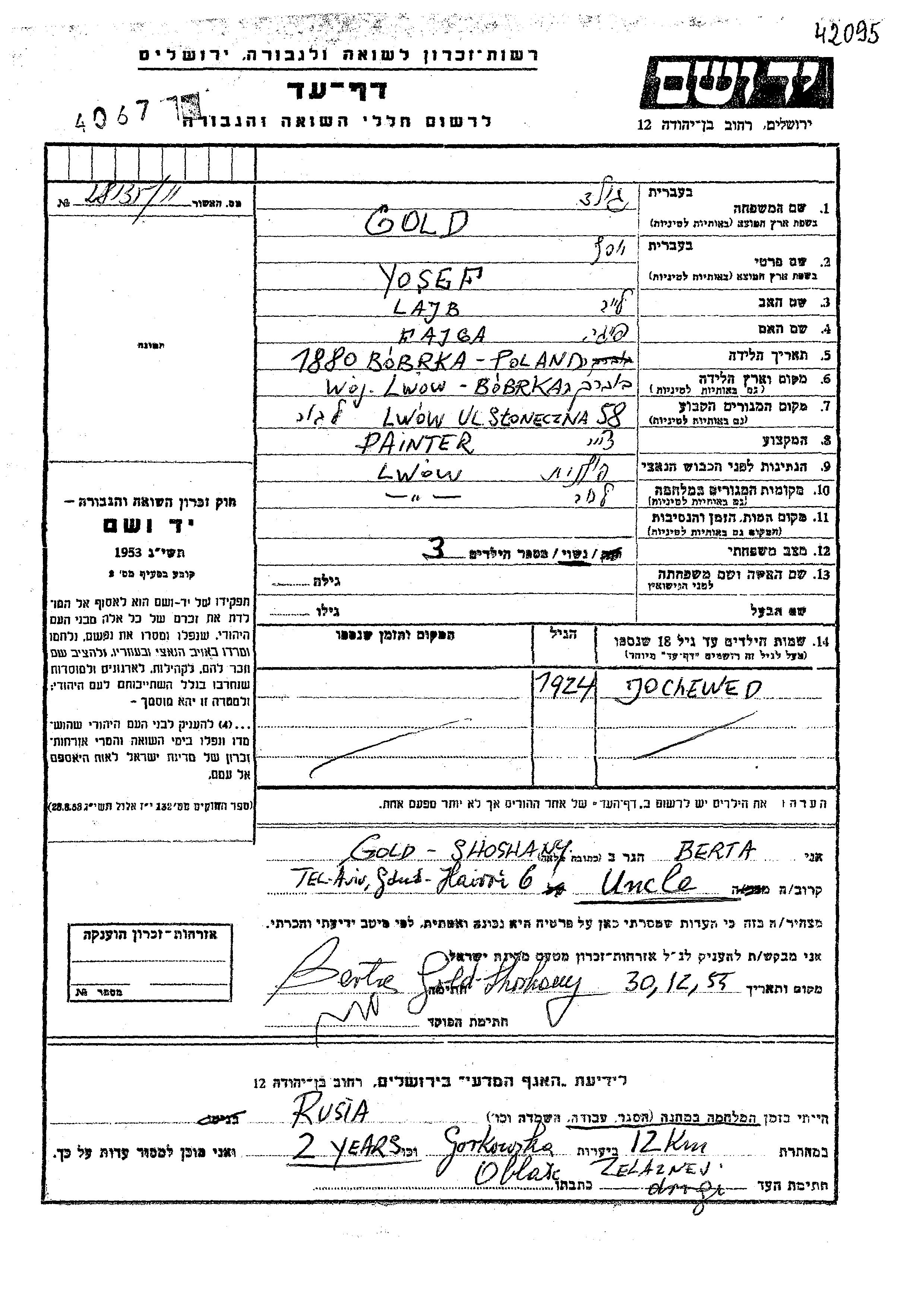 Yosef Gold wurde im Jahr 1880 in Bobrka, Polen geboren. Er war der Sohn von Lajb und Fajga. Er war Kunstmaler/-in und Verheiratet. Vor dem Zweiten Weltkrieg lebte er in Lwow, Polen. Während des Krieges war er in Lwow, Polen.