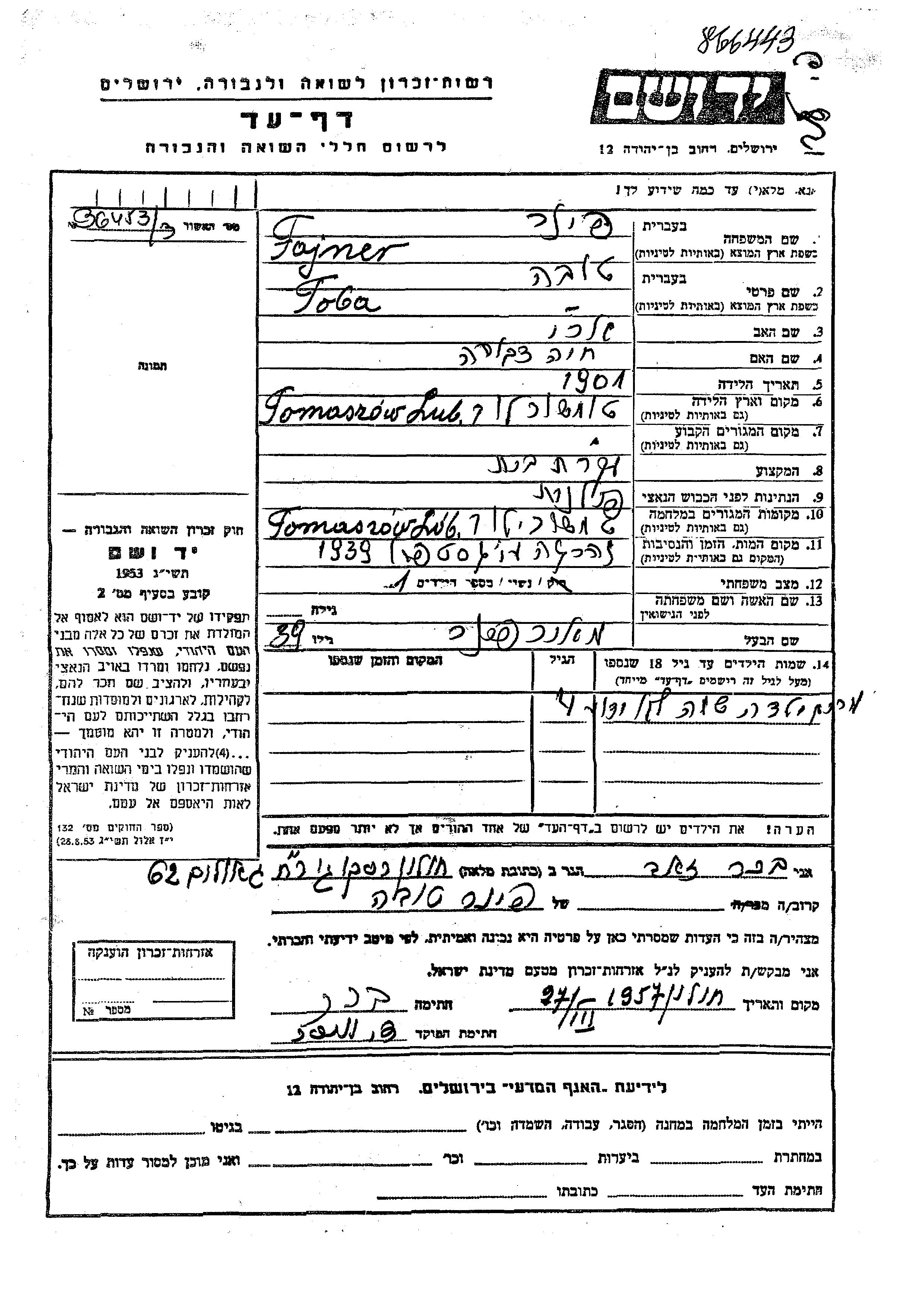 Toba Tova Fajner Finer wurde im Jahr 1901 in Tomaszow, Polen geboren. Sie war die Tochter von Arie und Khaia Dvora. Sie war Hausfrau und mit Meir Verheiratet. Vor dem Zweiten Weltkrieg lebte sie in Tomaszow, Polen. Während des Krieges war sie in Tomaszow, Polen.