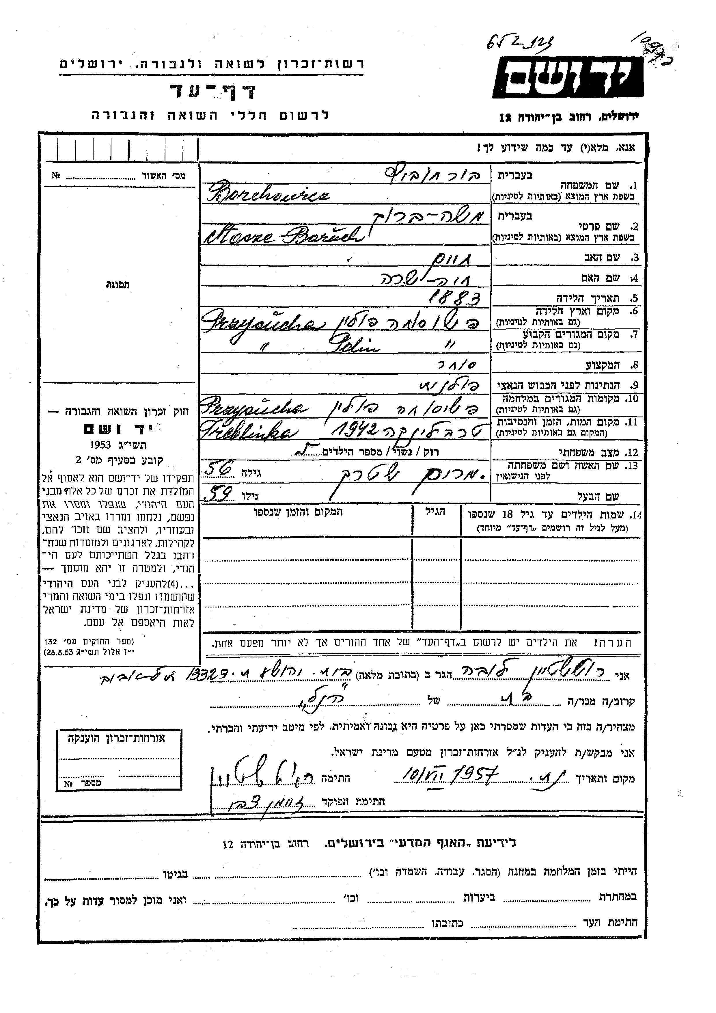 Mosze Baruch Borchowicz wurde im Jahr 1883 in Przysucha, Polen geboren. Er war der Sohn von Khaim und Khaia Sara. Er war Kaufmann/-frau und mit Miriam, geb. Shtark Verheiratet. Vor dem Zweiten Weltkrieg lebte er in Przysucha, Polen. Während des Krieges war er in Przysucha, Polen.