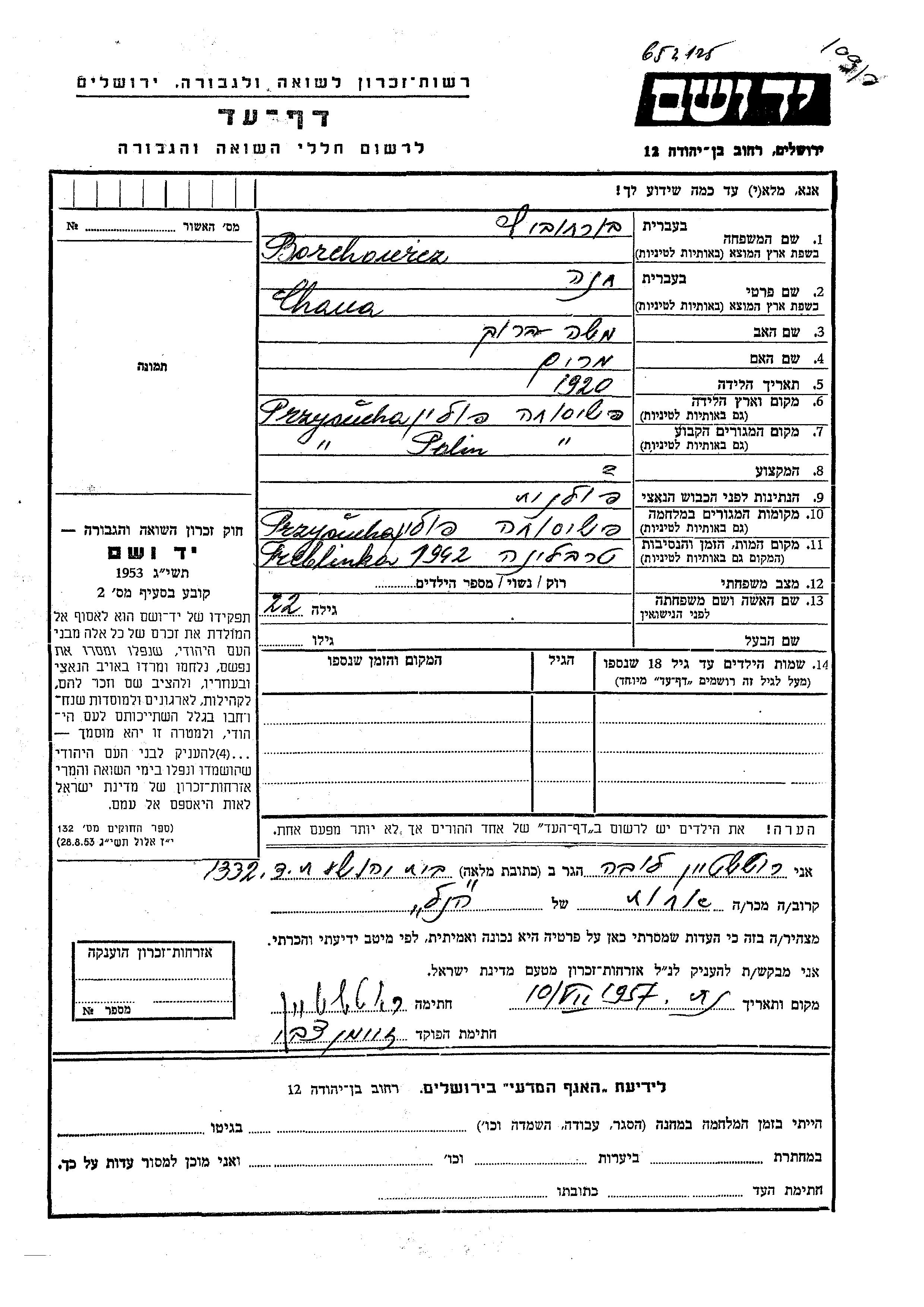 Borchowicz Chana 1920 Przysucha, Polen Gedenkblatt