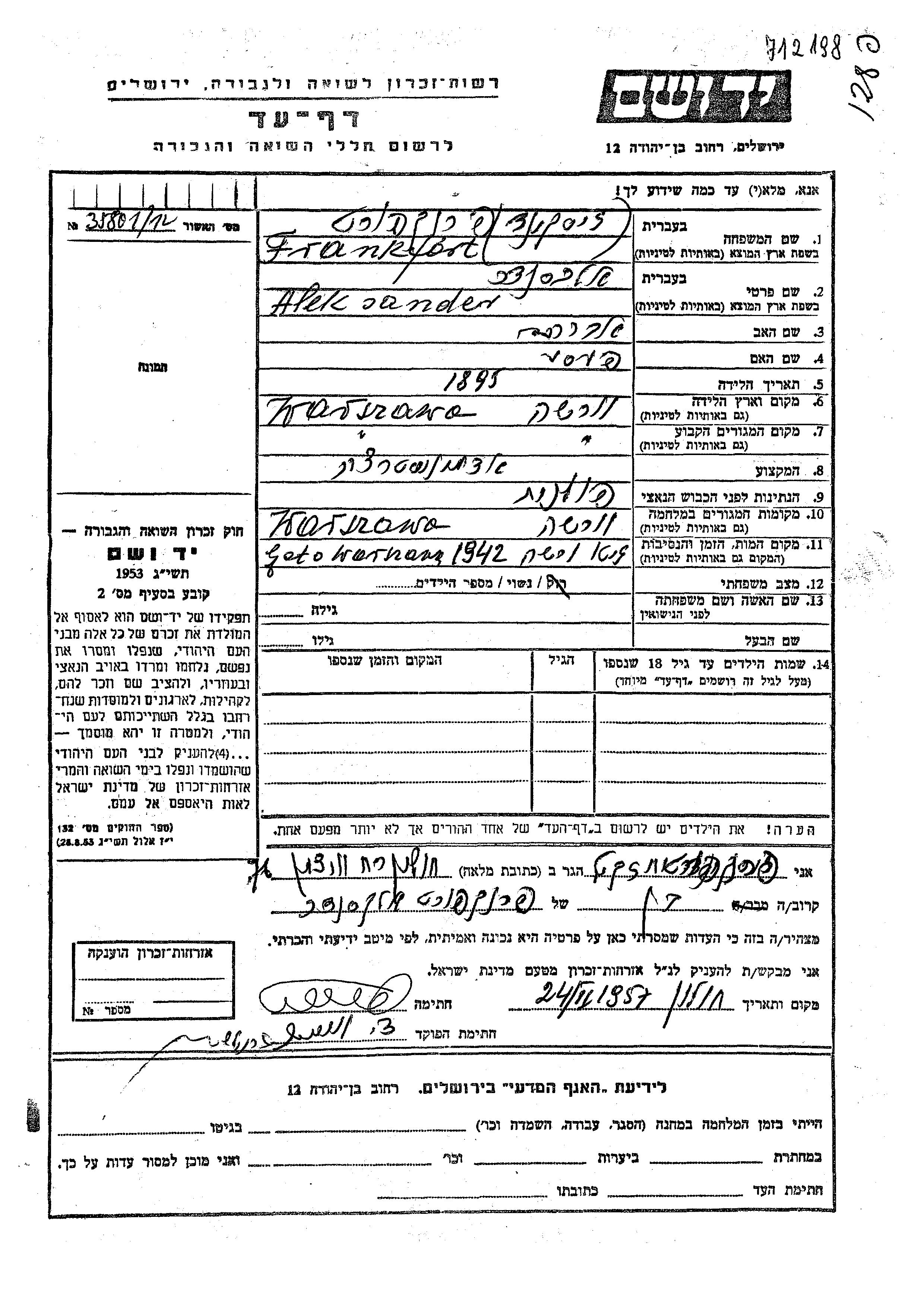Aleksander Frankfort wurde im Jahr 1895 in Warszawa, Polen geboren. Er war der Sohn von Avraham und Pese. Er war Verwalter und Verheiratet. Vor dem Zweiten Weltkrieg lebte er in Warszawa, Polen. Während des Krieges war er in Warszawa, Polen.