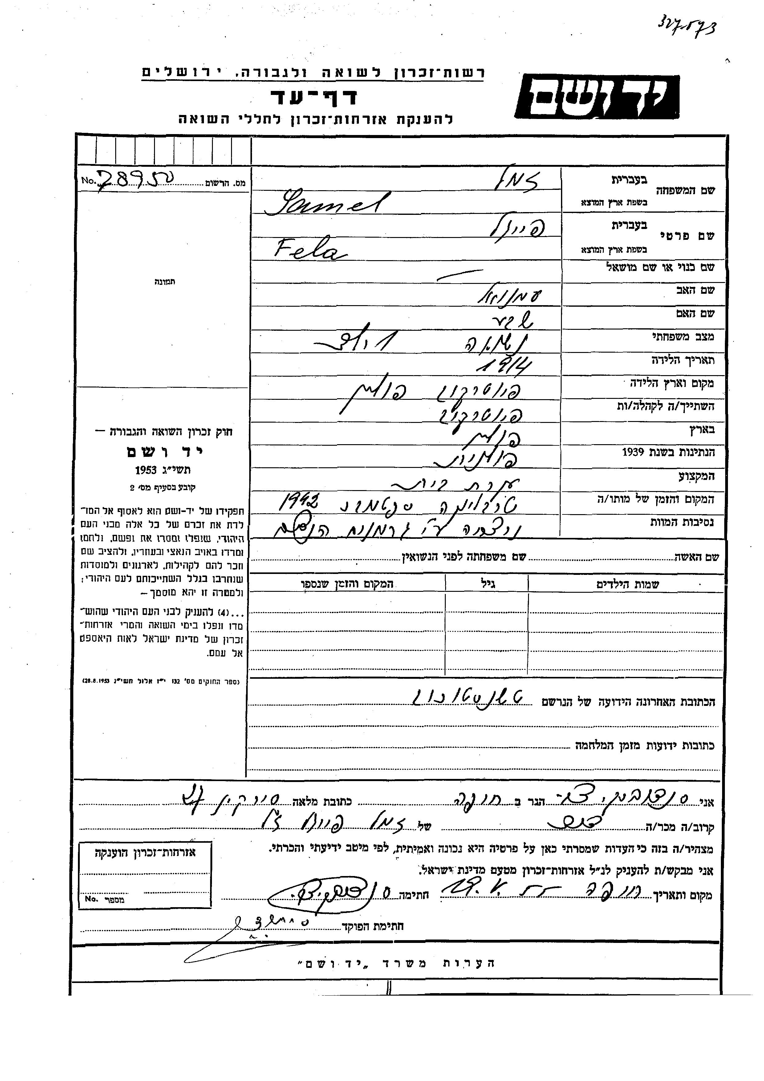 Fela Feigel Samel wurde im Jahr 1914 in Piotrkow Trybunalski, Polen geboren. Sie war die Tochter von Emanuel und Sheva. Sie war Hausfrau und Verheiratet. Vor dem Zweiten Weltkrieg lebte sie in Piotrkow Trybunalski, Polen. Während des Krieges war sie in Czestochowa, Polen.