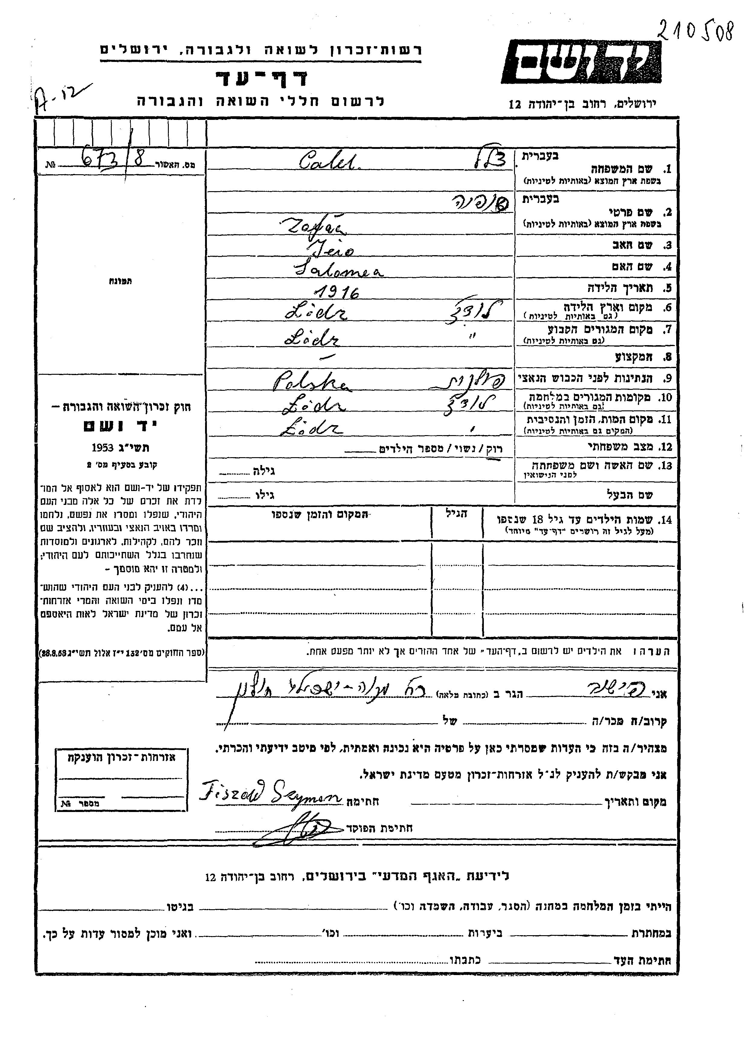 Zofia Calel wurde im Jahr 1916 in Lodz, Polen geboren. Sie war die Tochter von Jeno und Salomea. Sie war Ledig. Vor dem Zweiten Weltkrieg lebte sie in Lodz, Polen. Während des Krieges war sie in Lodz, Polen.