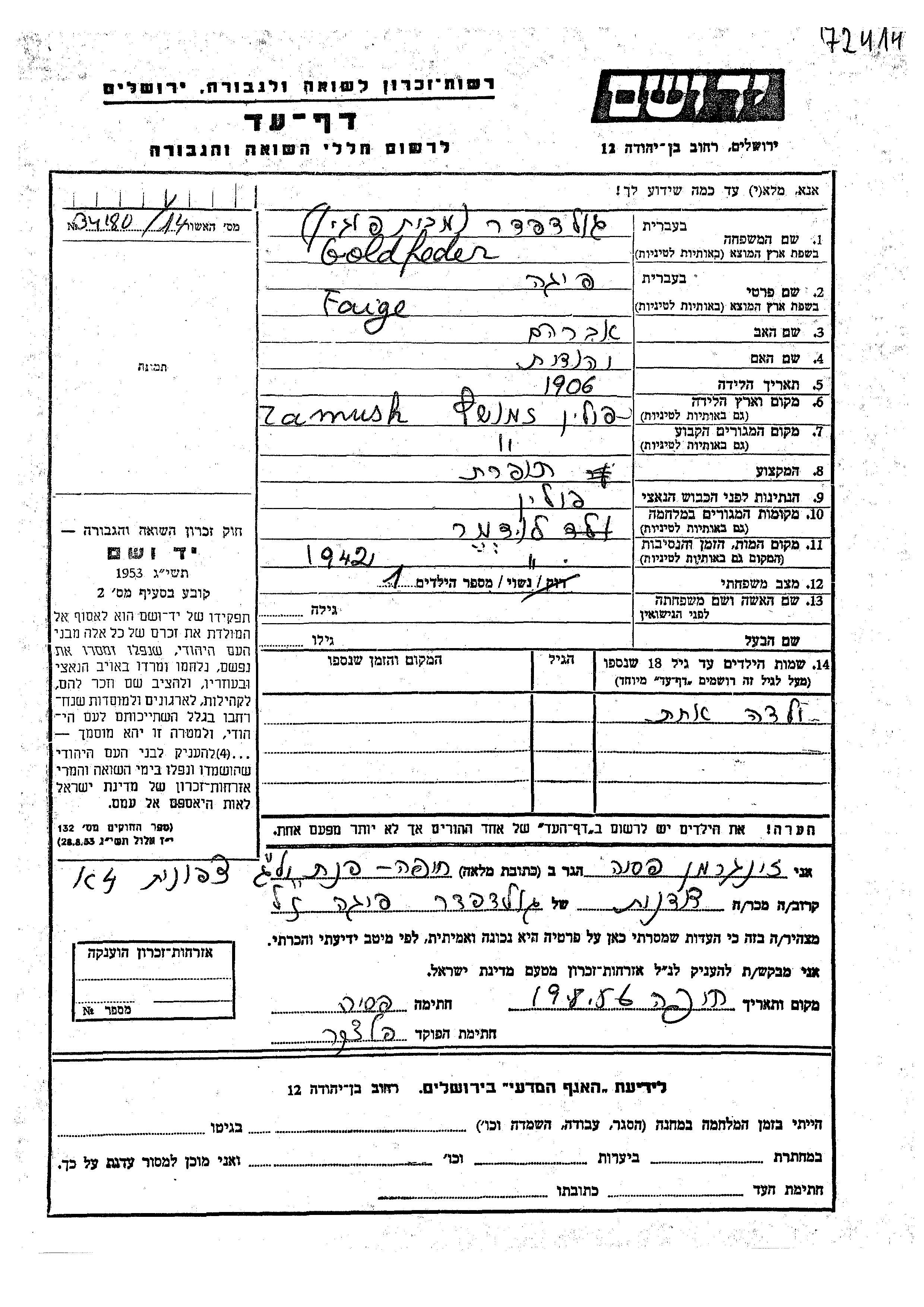 Faige Goldfeder, geb. Feigin wurde im Jahr 1906 in Zamosc, Polen geboren. Sie war die Tochter von Avraham und Yehudit. Sie war Schneiderin und Verheiratet. Vor dem Zweiten Weltkrieg lebte sie in Zamosc, Polen. Während des Krieges war sie in Wlodzimierz, Polen.