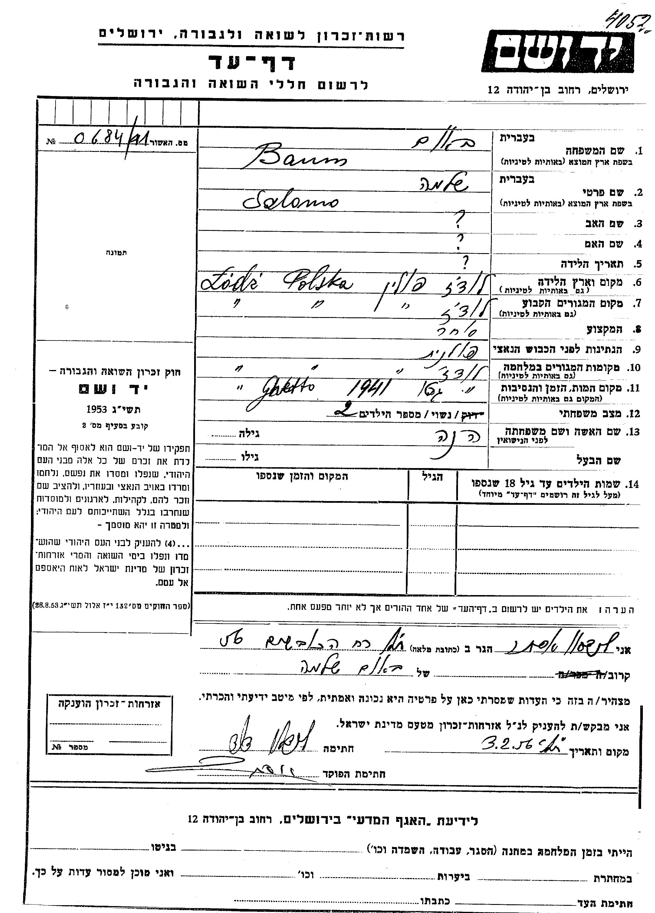 Szlomo Baum wurde in Lodz, Polen geboren. Er war Kaufmann/-frau und mit Hena Verheiratet. Vor dem Zweiten Weltkrieg lebte er in Lodz, Polen. Während des Krieges war er in Lodz, Polen.