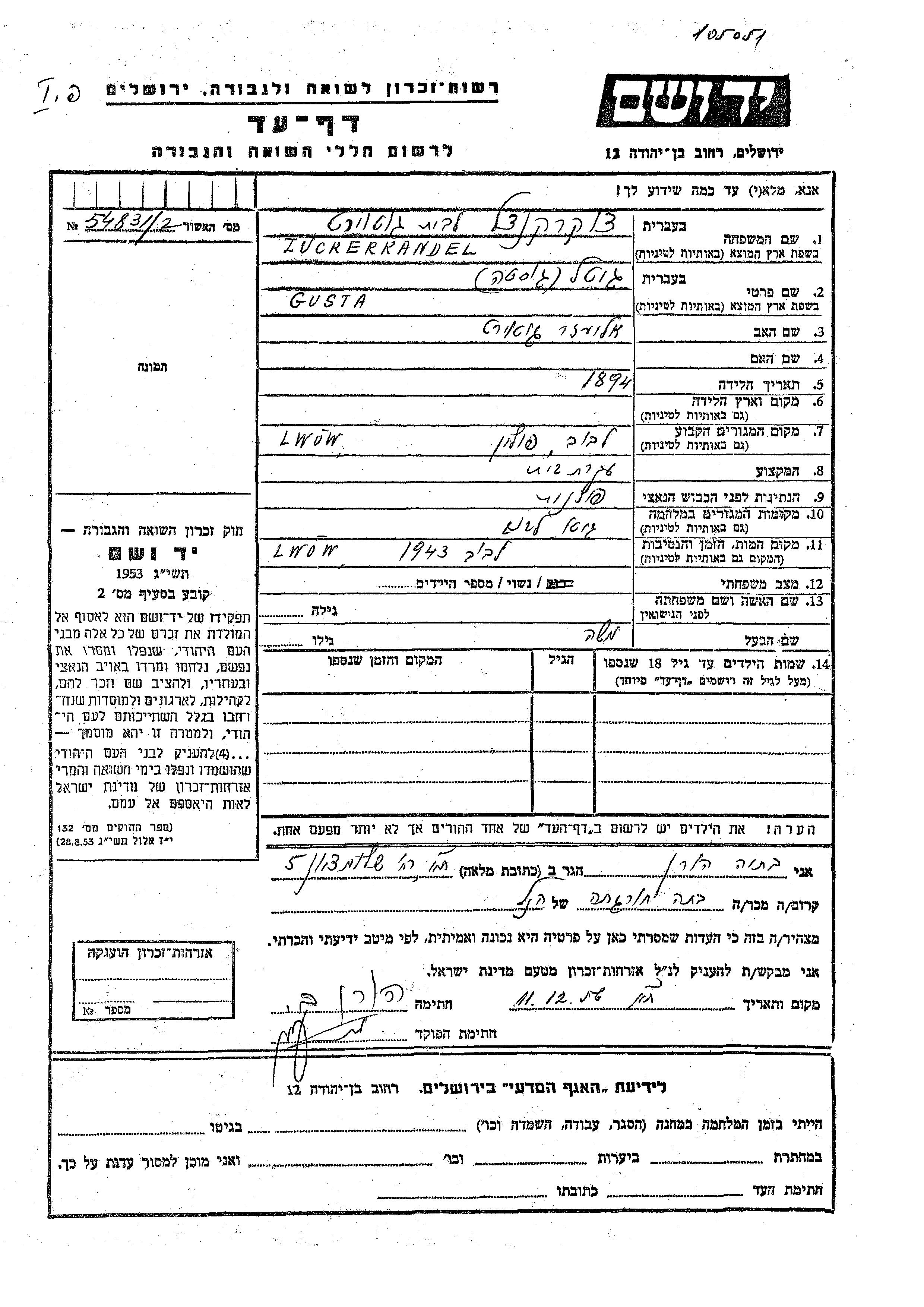 Gusta Gitel Zuckerkandel, geb. Gutvirt wurde im Jahr 1894 geboren. Sie war die Tochter von Eliezer. Sie war Hausfrau und mit Moshe Verheiratet. Vor dem Zweiten Weltkrieg lebte sie in Lwow, Polen. Während des Krieges war sie in Lwow, Polen.