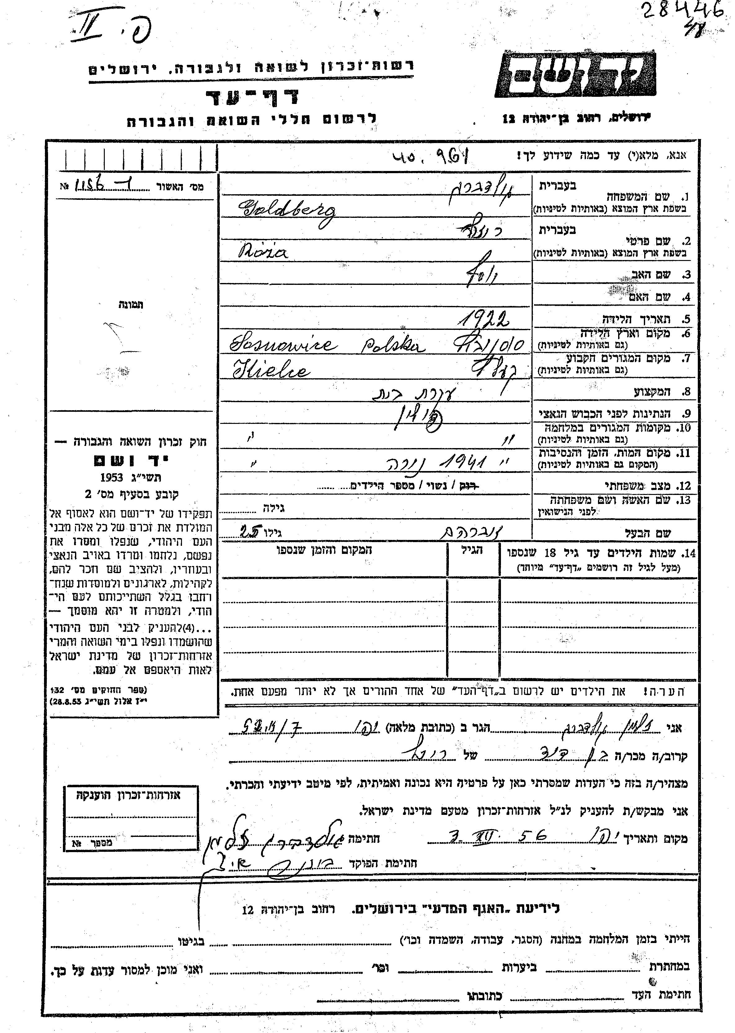 Roza Goldberg wurde im Jahr 1922 in Sosnowiec, Polen geboren. Sie war die Tochter von Yosef. Sie war Hausfrau und mit Avraham Verheiratet. Vor dem Zweiten Weltkrieg lebte sie in Kielce, Polen. Während des Krieges war sie in Kielce, Polen.