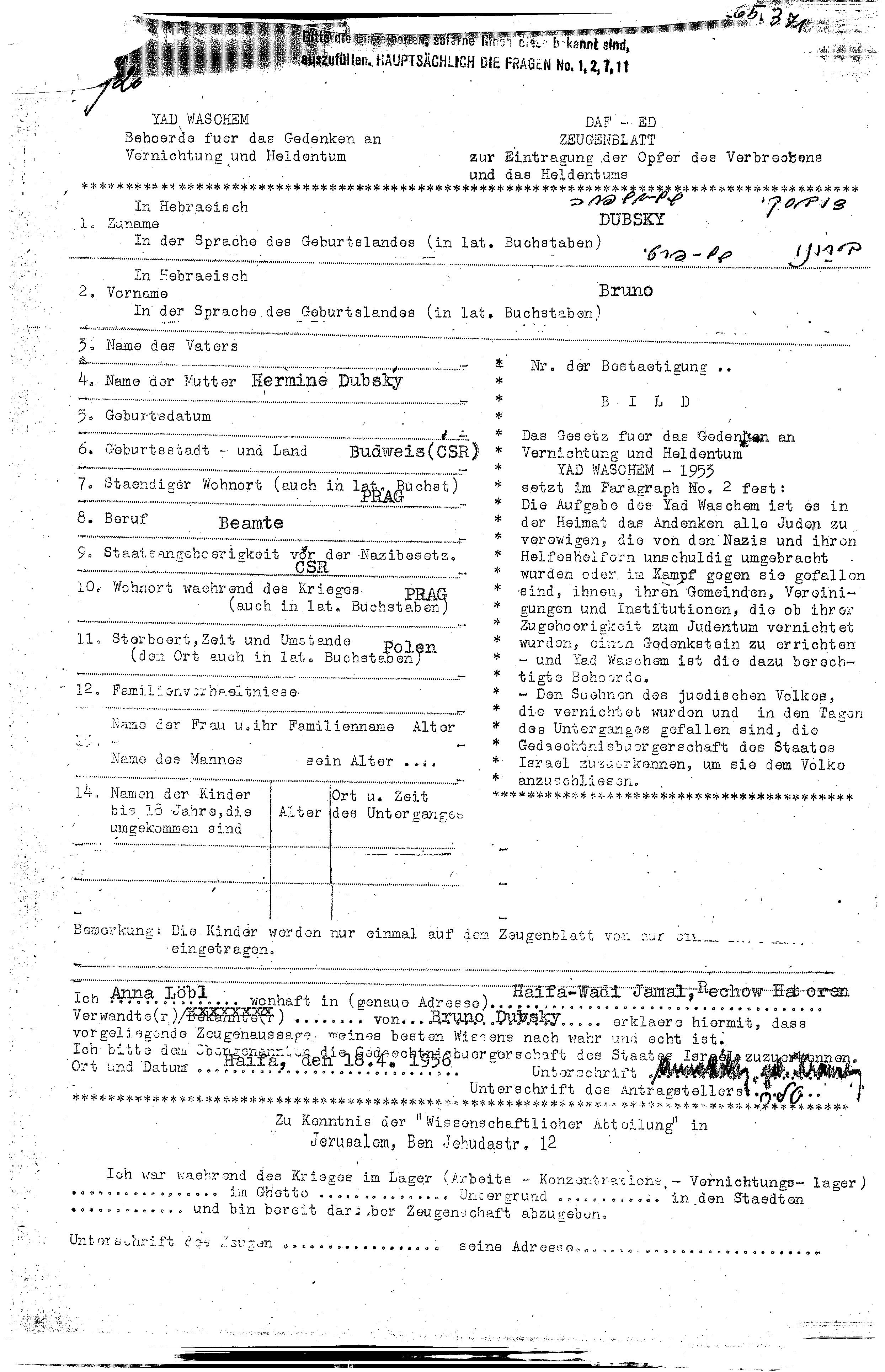 Bruno Dubsky wurde in Budweis, Tschechoslowakei geboren. Er war der Sohn von Hermine. Er war Angestellte/-r. Vor dem Zweiten Weltkrieg lebte er in Prague, Tschechoslowakei. Während des Krieges war er in Prague, Tschechoslowakei.
