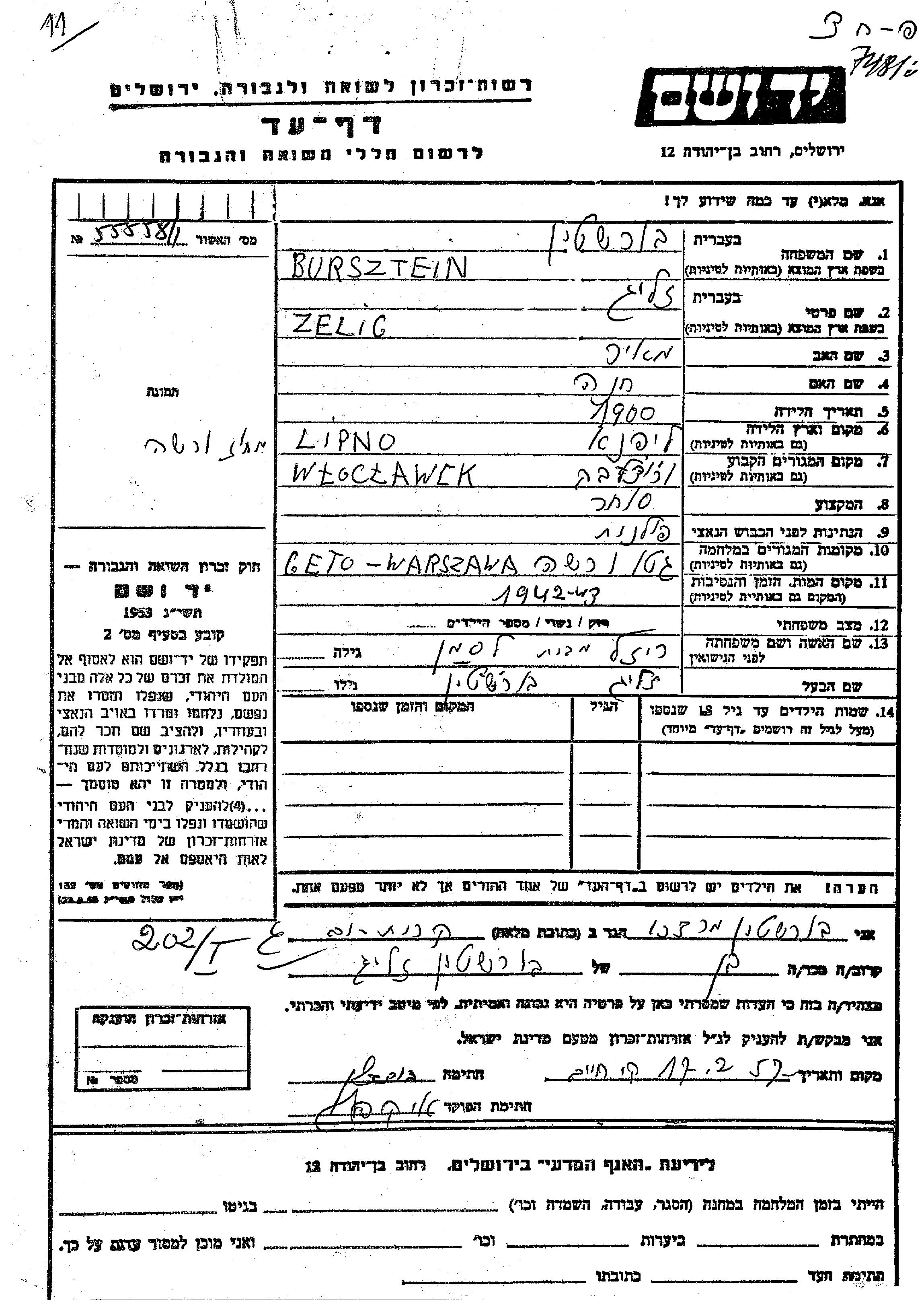 Zelig Bursztein wurde im Jahr 1900 in Lipno, Polen geboren. Er war der Sohn von Meir und Khana. Er war Kaufmann/-frau und mit Reizel, geb. Lesman Verheiratet. Vor dem Zweiten Weltkrieg lebte er in Wloclawek, Polen. Während des Krieges war er in Warszawa, Polen.