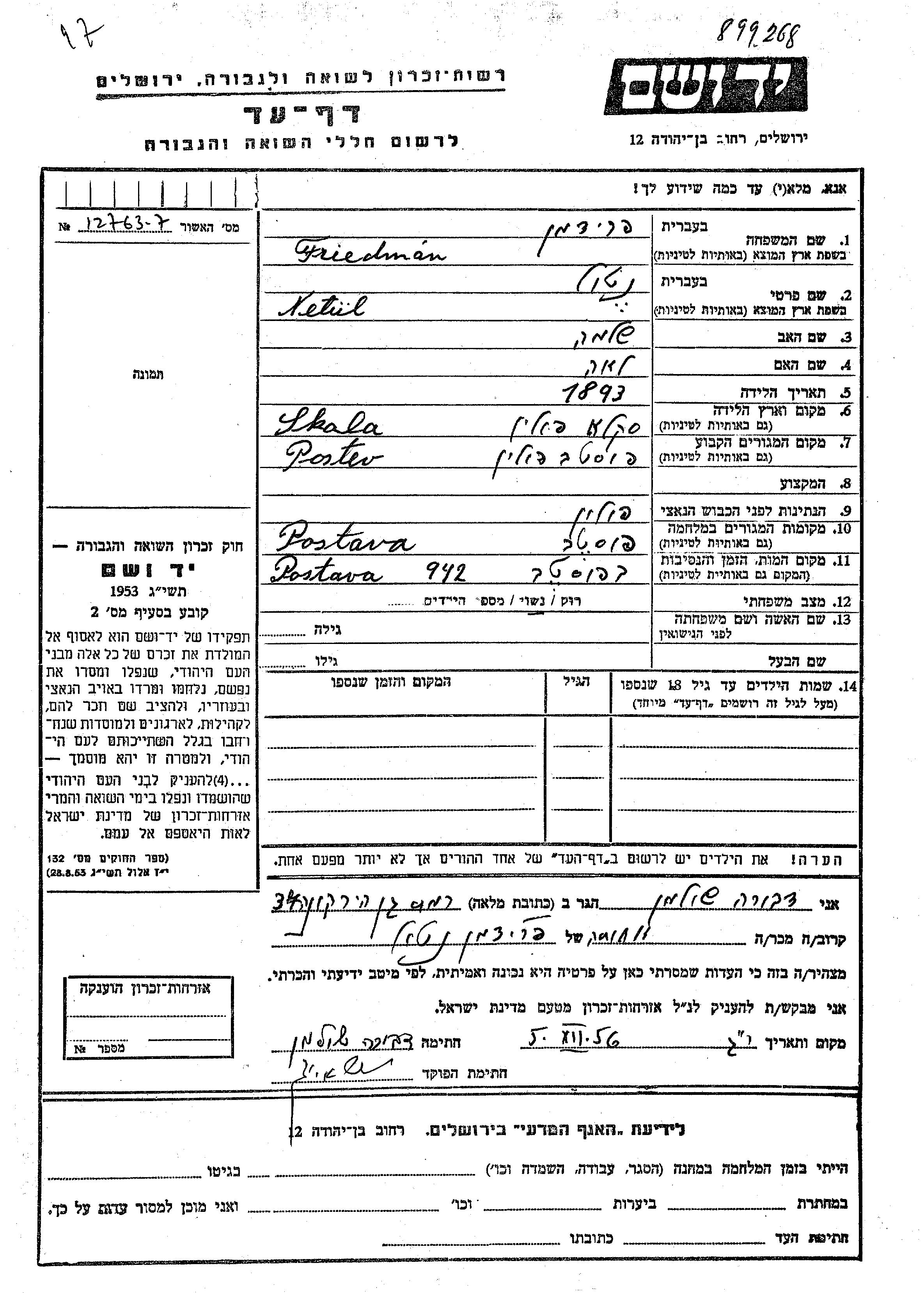 Netil Friedman wurde im Jahr 1893 in Skala, Polen geboren. Sie war die Tochter von Shlomo und Lea. Sie war Verheiratet. Vor dem Zweiten Weltkrieg lebte sie in Postawy, Polen. Während des Krieges war sie in Postawy, Polen.