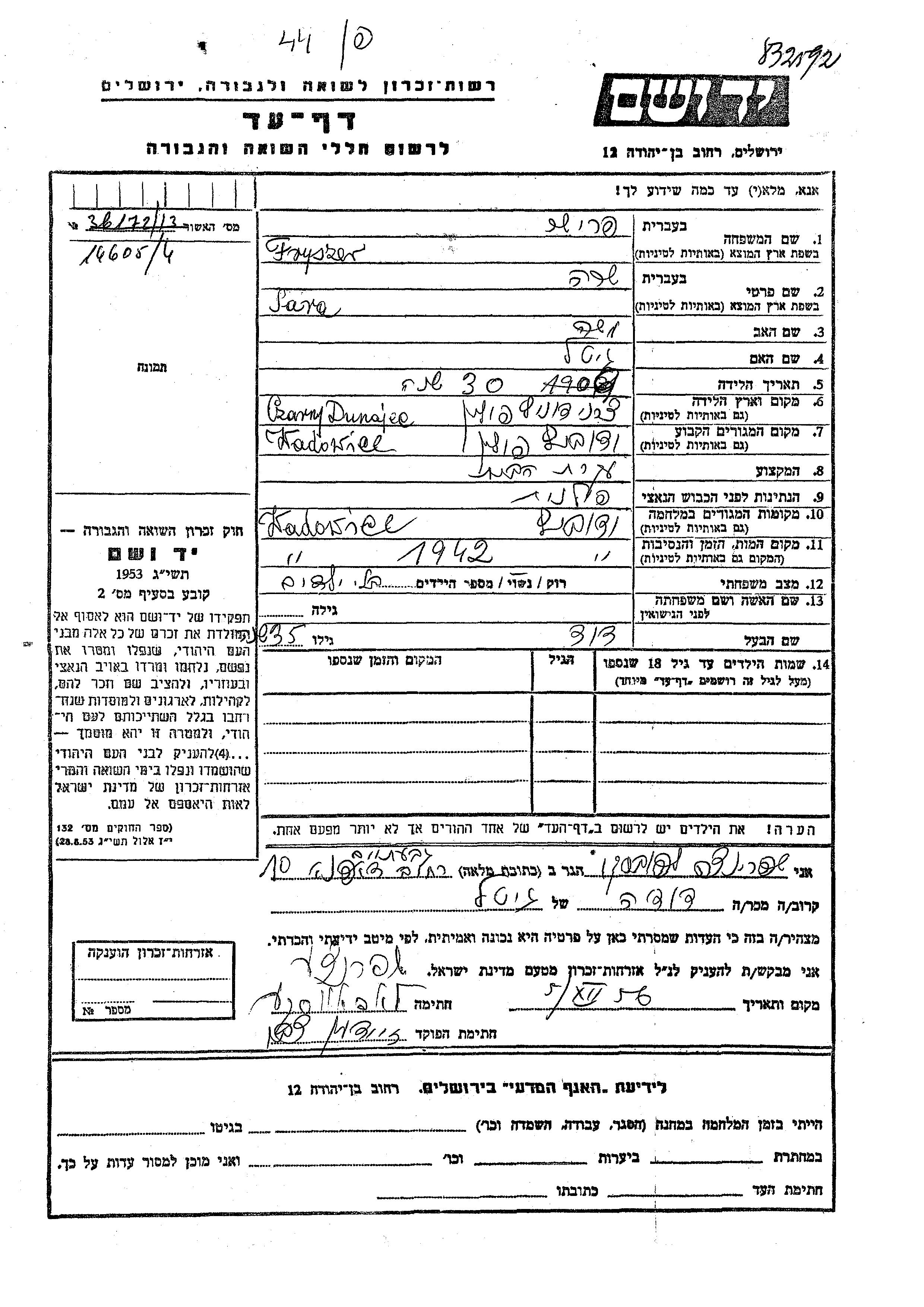 Sara Fryszer wurde im Jahr 1909 in Czarny Dunajec, Polen geboren. Sie war die Tochter von Moshe und Gitel. Sie war Hausfrau und mit David Verheiratet. Vor dem Zweiten Weltkrieg lebte sie in Wadowice, Polen. Während des Krieges war sie in Wadowice, Polen.