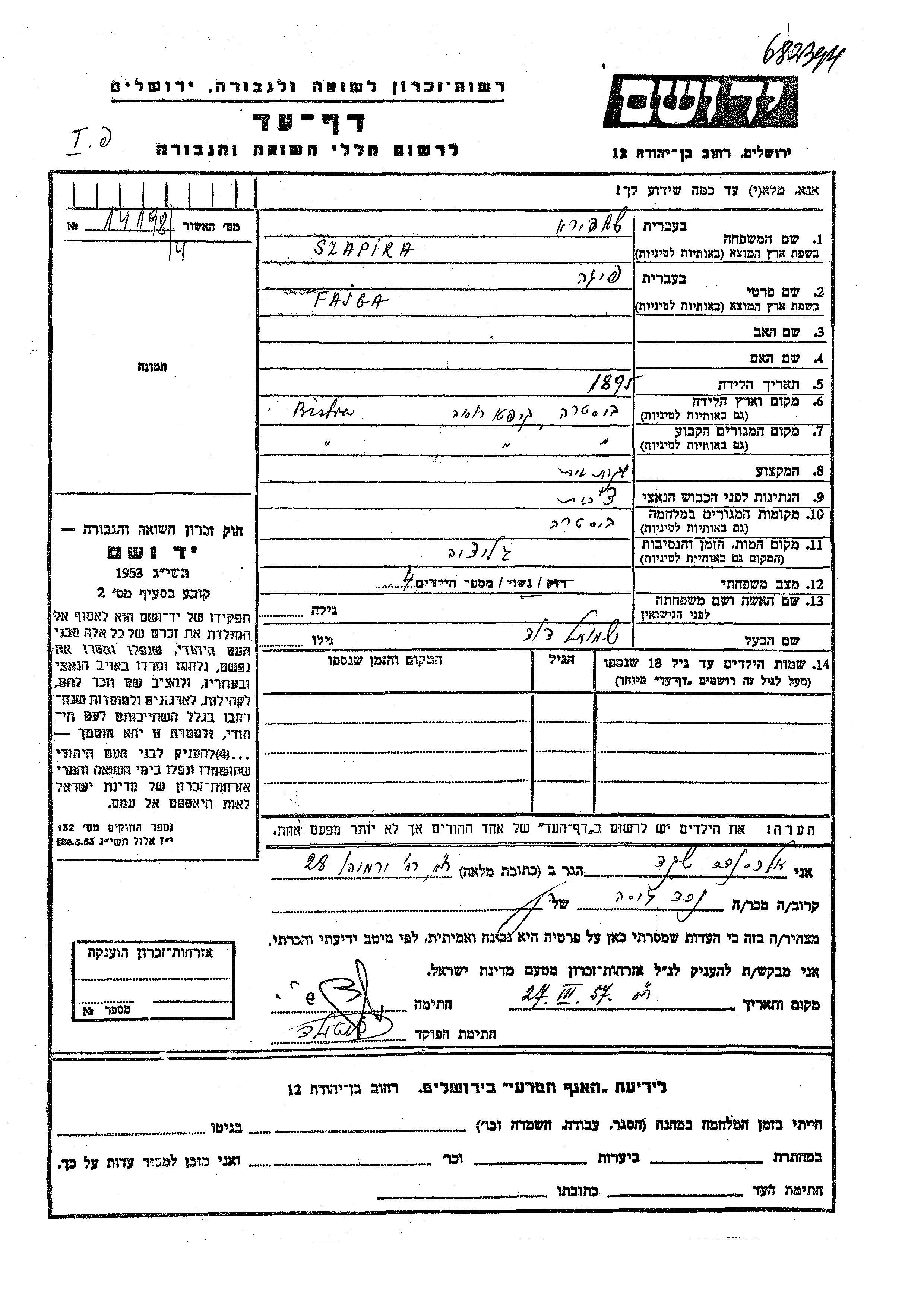 Fajga Szapira wurde im Jahr 1895 in Bisztra, Tschechoslowakei geboren. Sie war Hausfrau und mit Shmuel David Verheiratet. Vor dem Zweiten Weltkrieg lebte sie in Bisztra, Tschechoslowakei. Während des Krieges war sie in Bisztra, Tschechoslowakei.