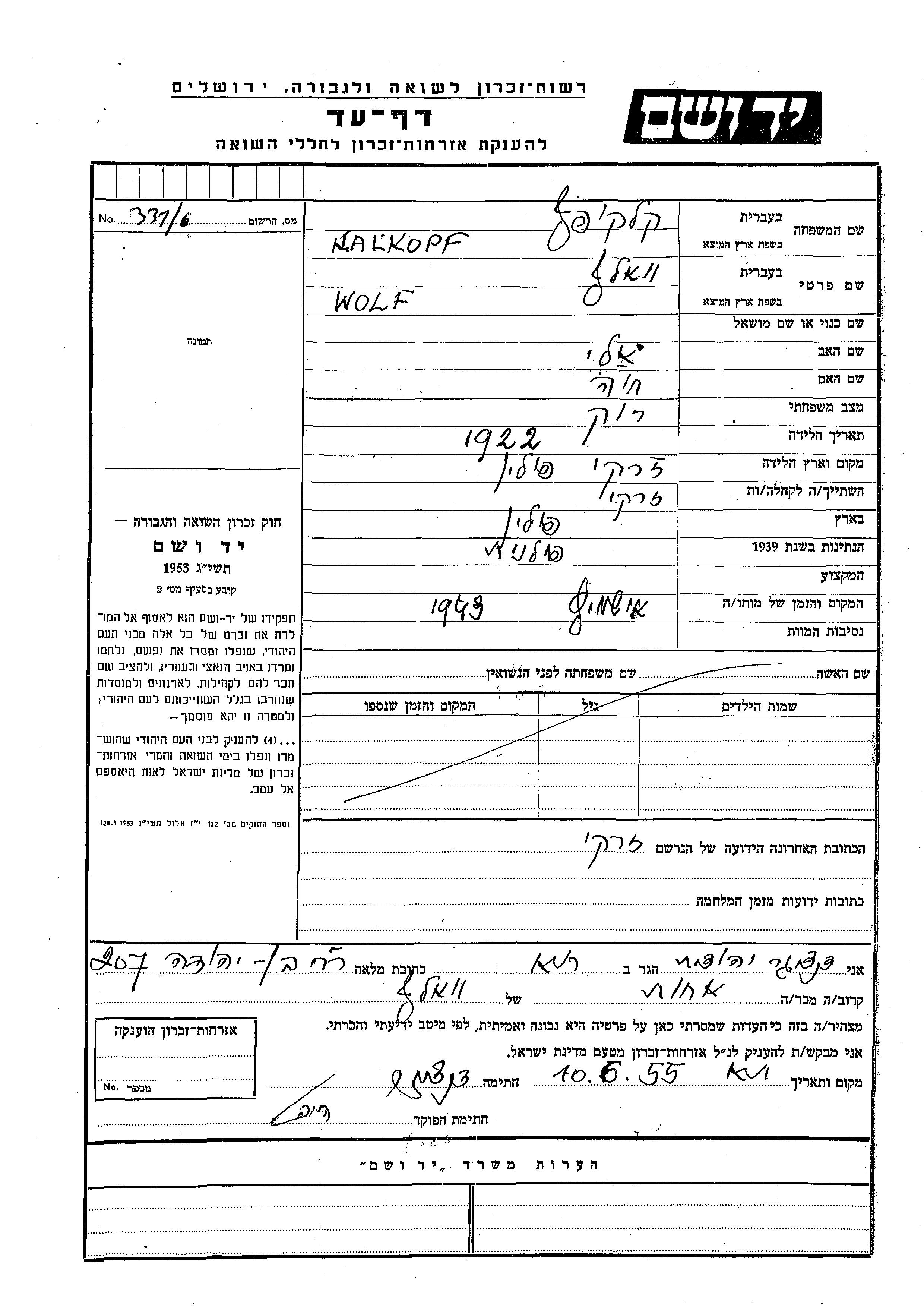 Wolf wurde in der Schoah ermordet. Todesort: Auschwitz, Polen im Jahr 1943.