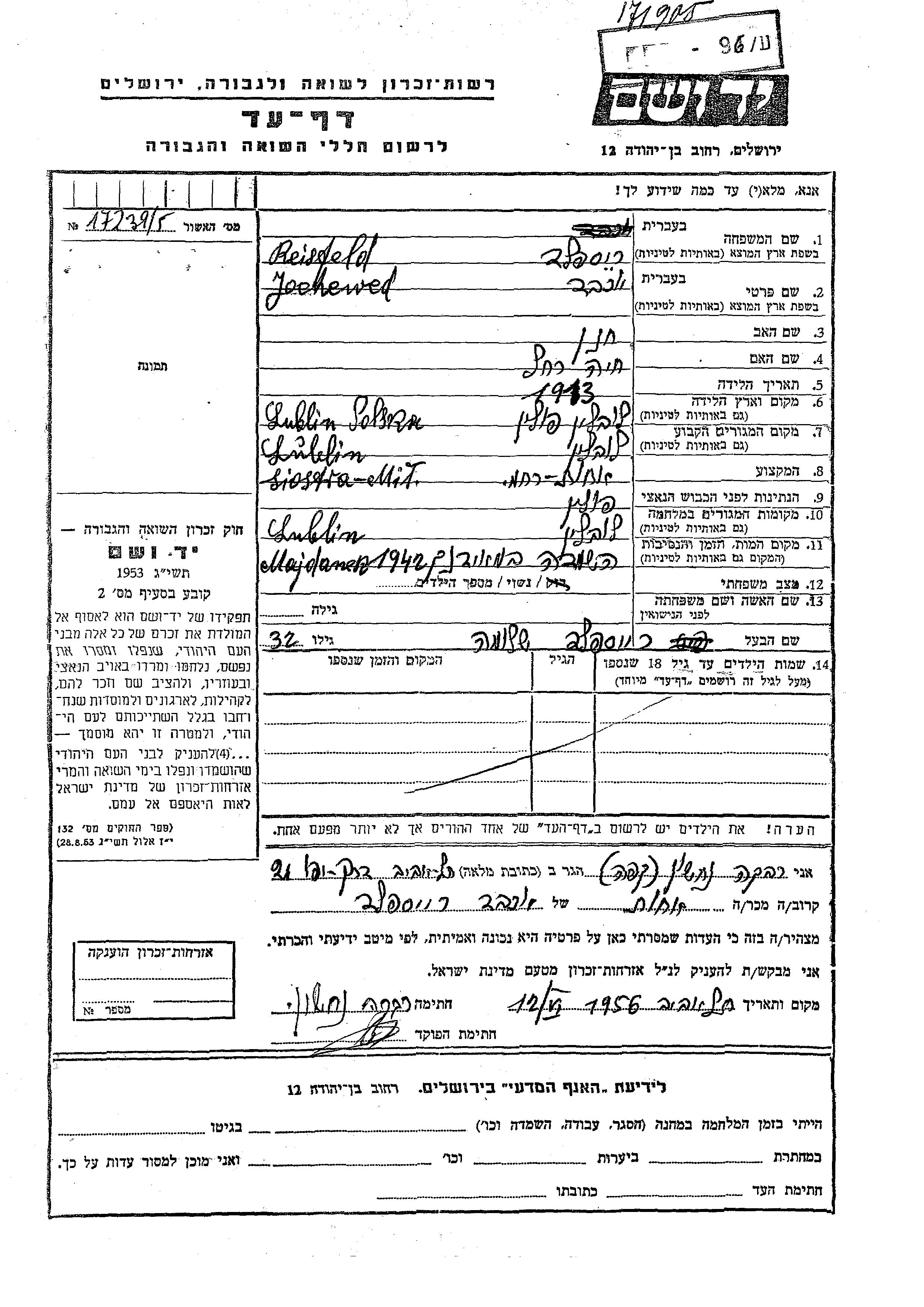 Yochewed wurde in der Schoah ermordet. Todesort: Majdanek, Polen im Jahr 1942.