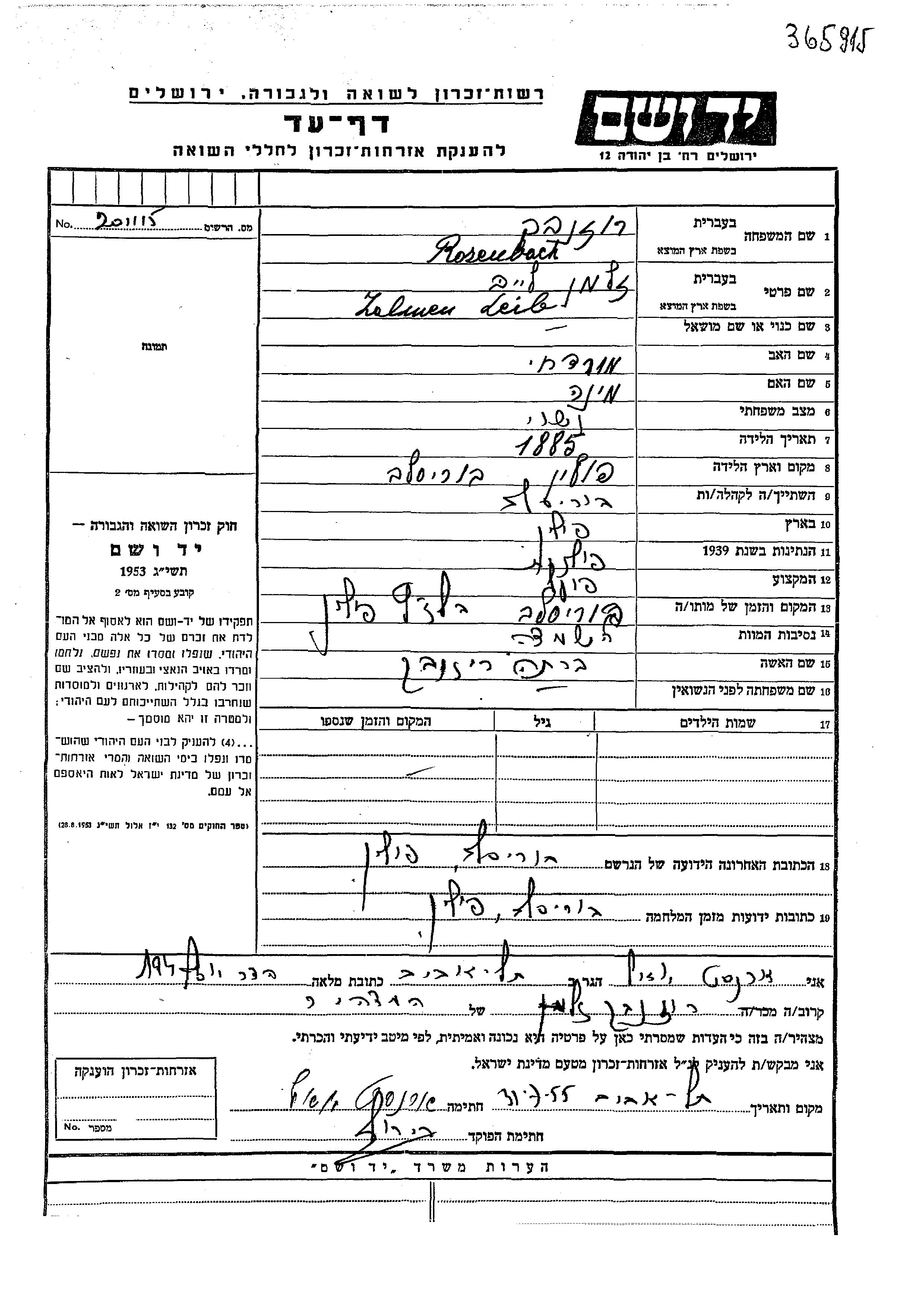Zalman Leib Rosenbach wurde im Jahr 1885 in Borislav, Polen geboren. Er war der Sohn von Mordekhai und Mina. Er war Arbeiter/-in. Vor dem Zweiten Weltkrieg lebte er in Borislav, Polen. Während des Krieges war er in Borislav, Polen.