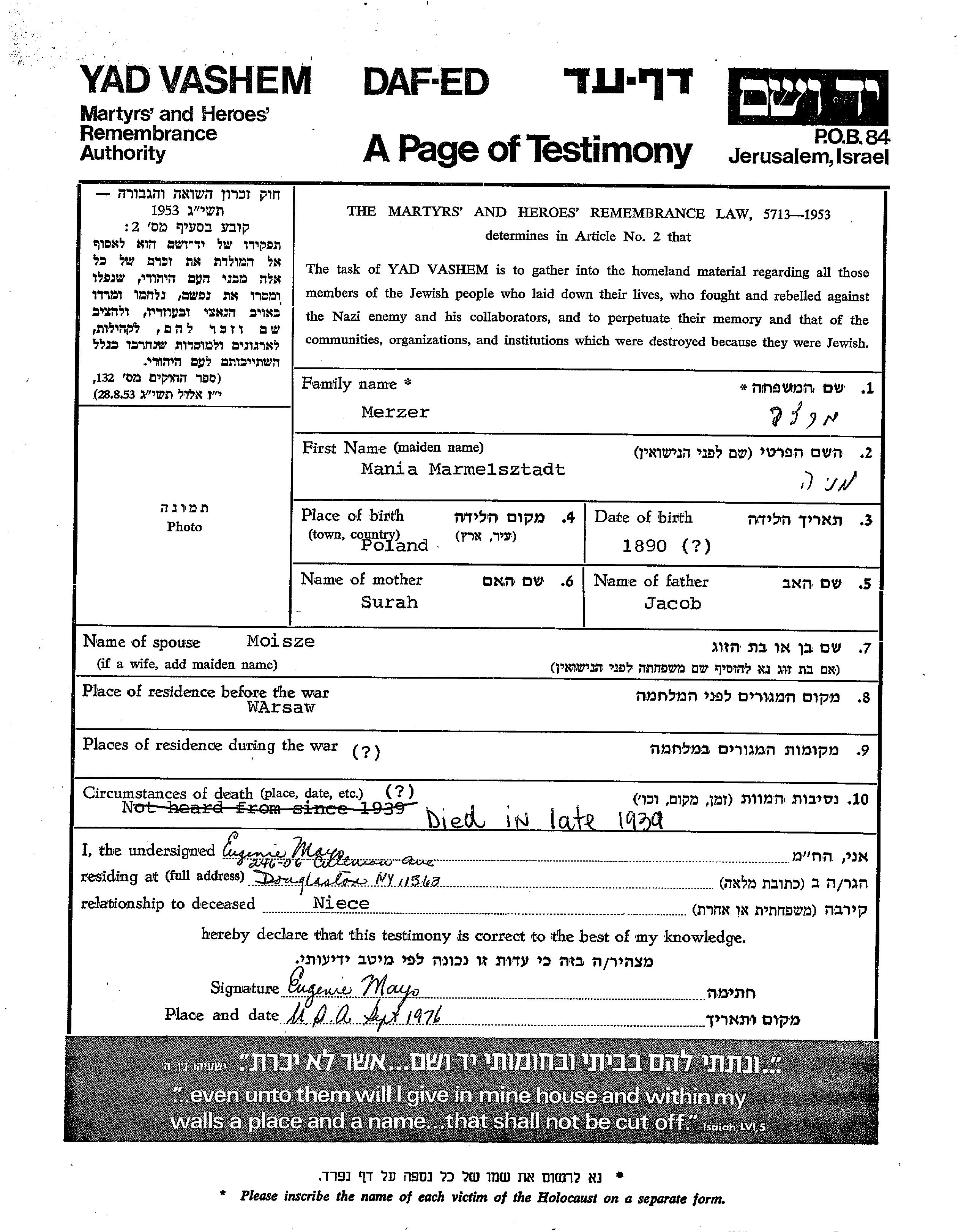 Mania Merzer, geb. Marmelsztadt wurde im Jahr 1890 in Polen geboren. Sie war die Tochter von Jacob und Surah. Sie war mit Moisze Verheiratet. Vor dem Zweiten Weltkrieg lebte sie in Warsaw, Polen.