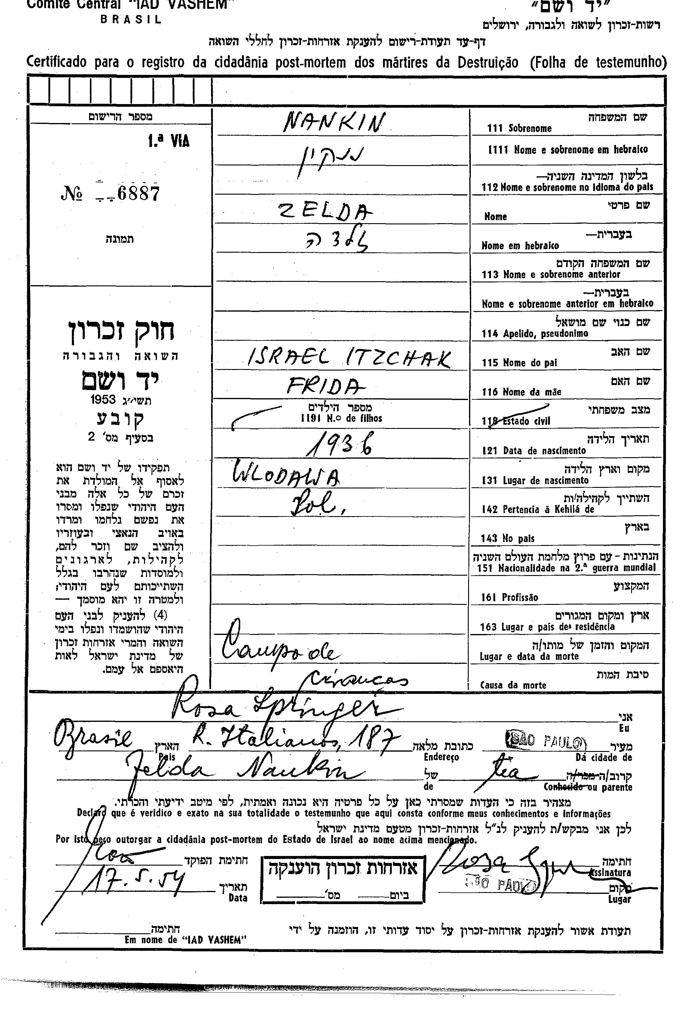 Zelda Nankin wurde im Jahr 1936 in Wlodawa, Polen geboren. Sie war die Tochter von Israel Itzchak und Frida. Sie war Ledig.