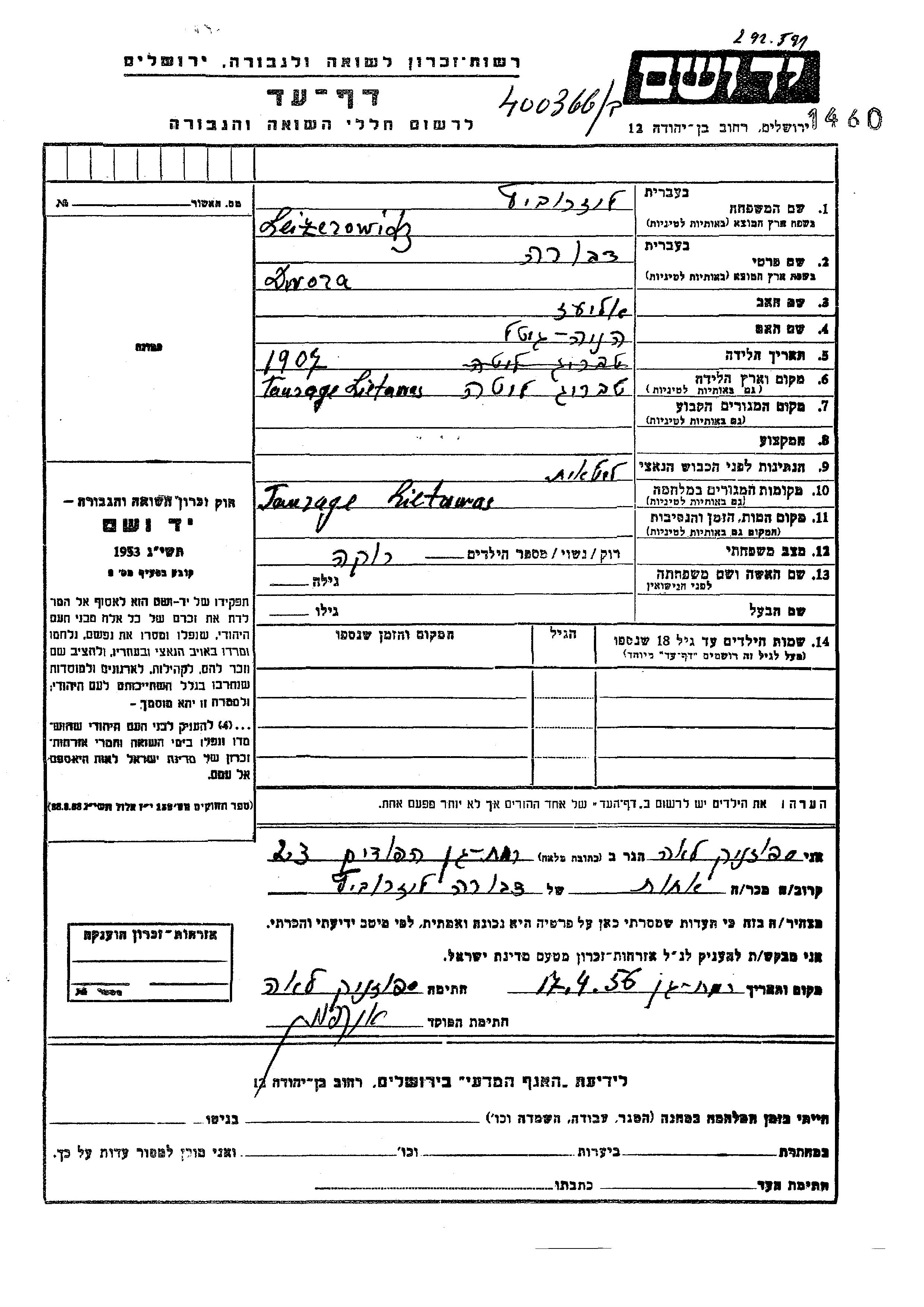 Dwora Leizerowicz wurde im Jahr 1907 in Taurogi, Litauen geboren. Sie war die Tochter von Eliahu und Henia Gitel. Sie war Ledig. Während des Krieges war sie in Taurogi, Litauen.