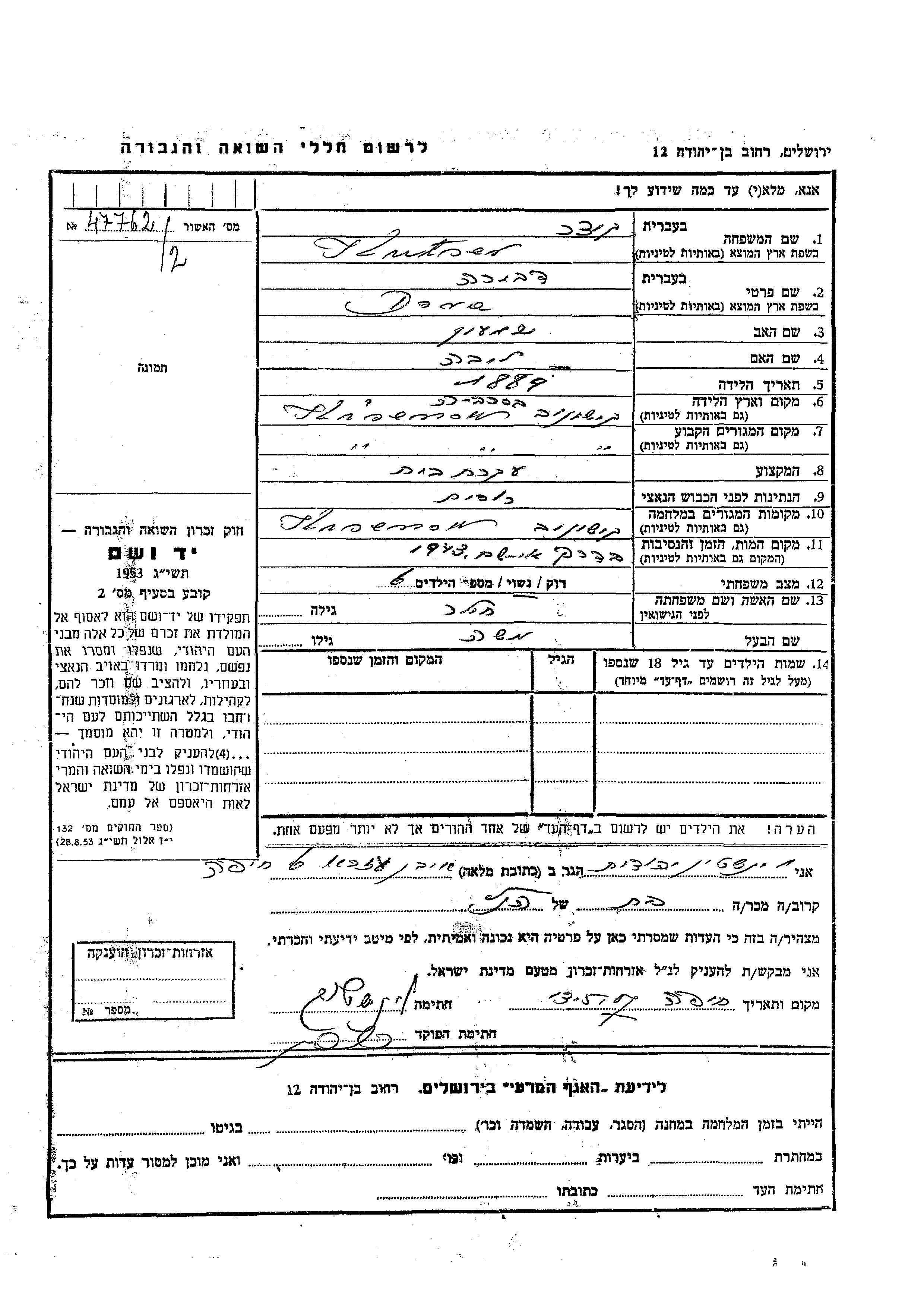 Dova Dvora Kutser Kider, geb. Khiler wurde im Jahr 1889 in Kishinev, Rumänien geboren. Sie war die Tochter von Shimon und Liba. Sie war Hausfrau und mit Moshe Verheiratet. Vor dem Zweiten Weltkrieg lebte sie in Kishinev, Rumänien. Während des Krieges war sie in Kishinev, Rumänien.