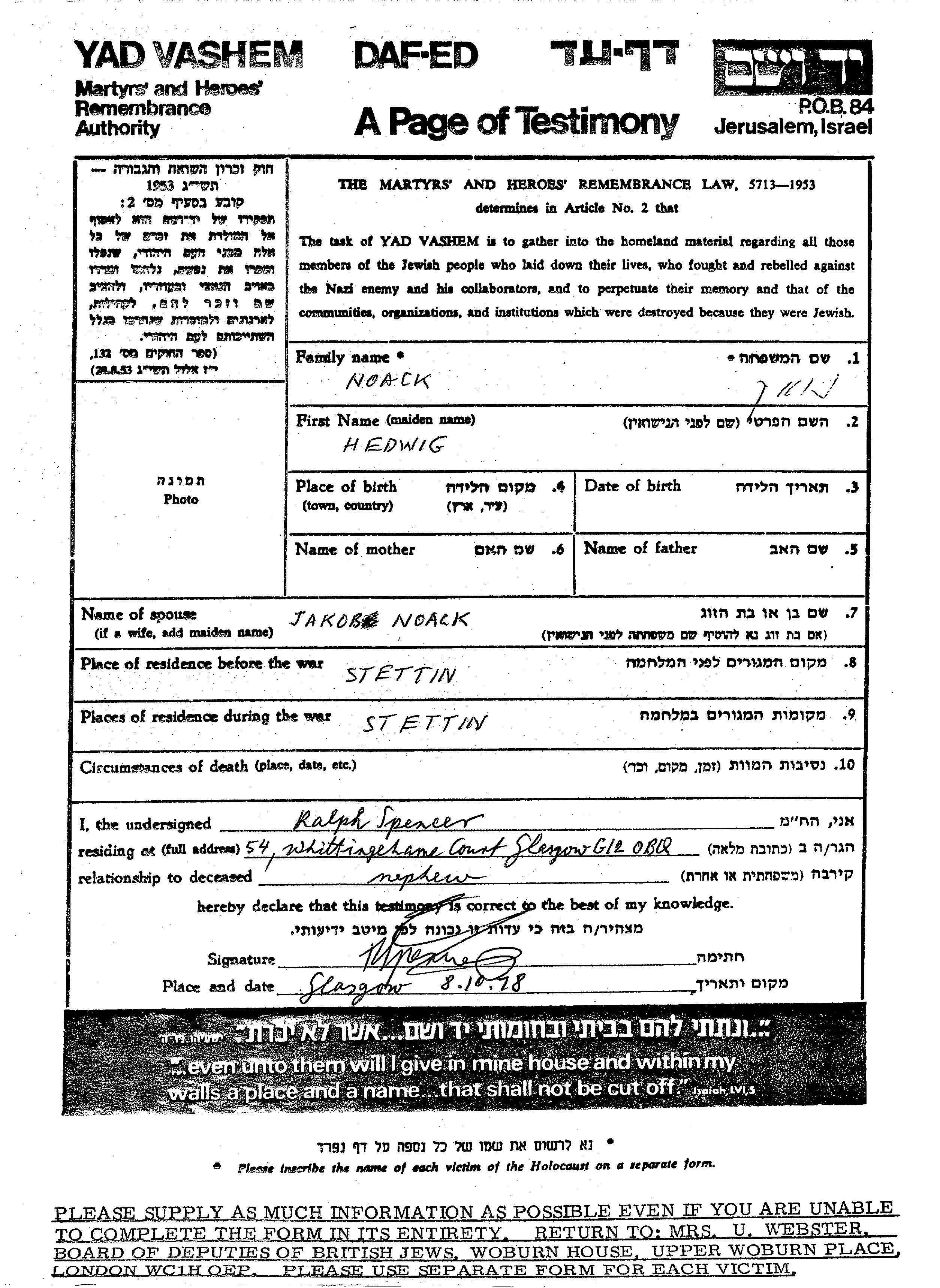 Hedwig Noack. Sie war mit Jakob Verheiratet. Vor dem Zweiten Weltkrieg lebte sie in Stettin, Deutsches Reich. Während des Krieges war sie in Stettin, Deutsches Reich.
