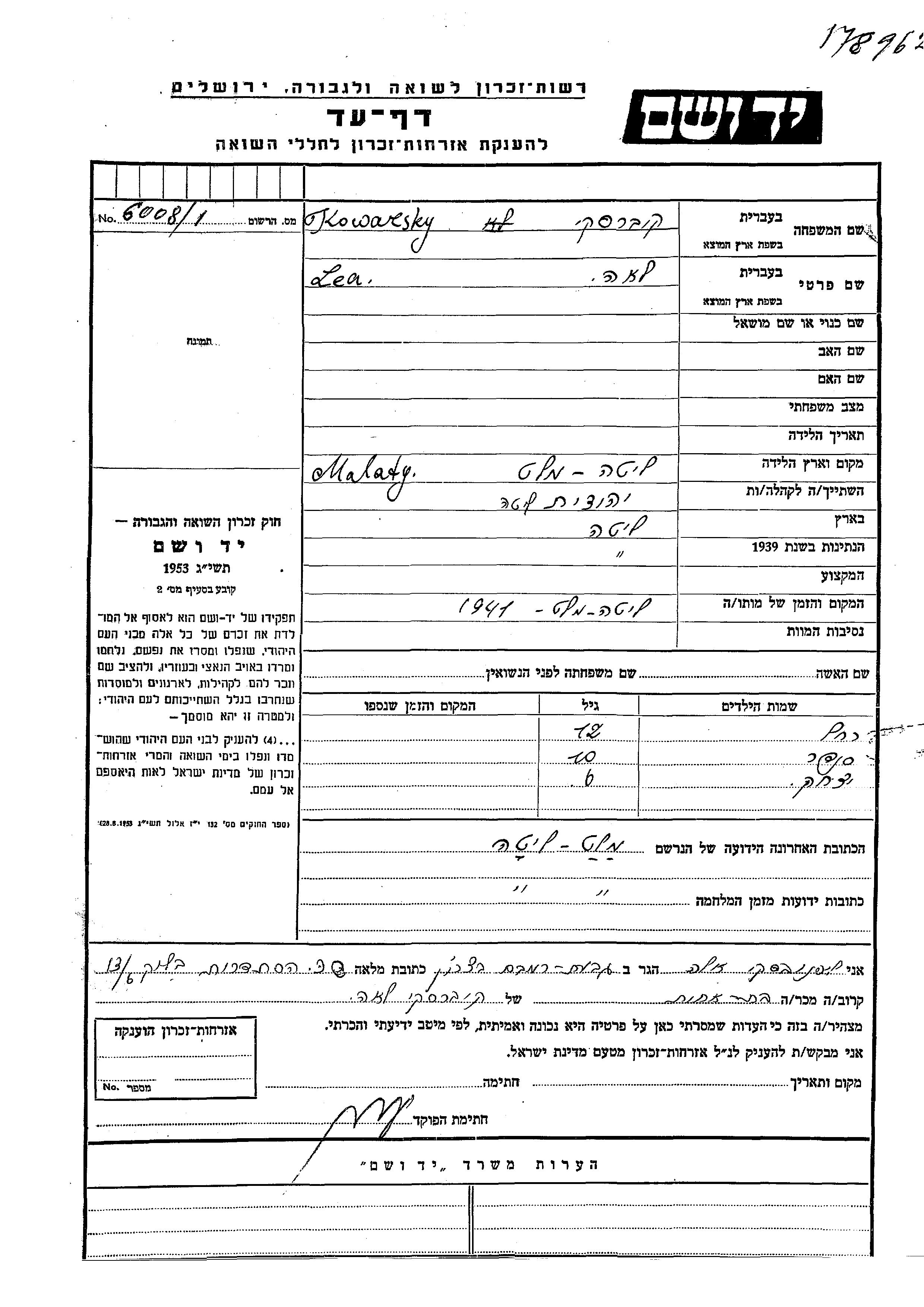 Lea wurde in der Schoah ermordet. Todesort: Malat, Litauen im Jahr 1941.