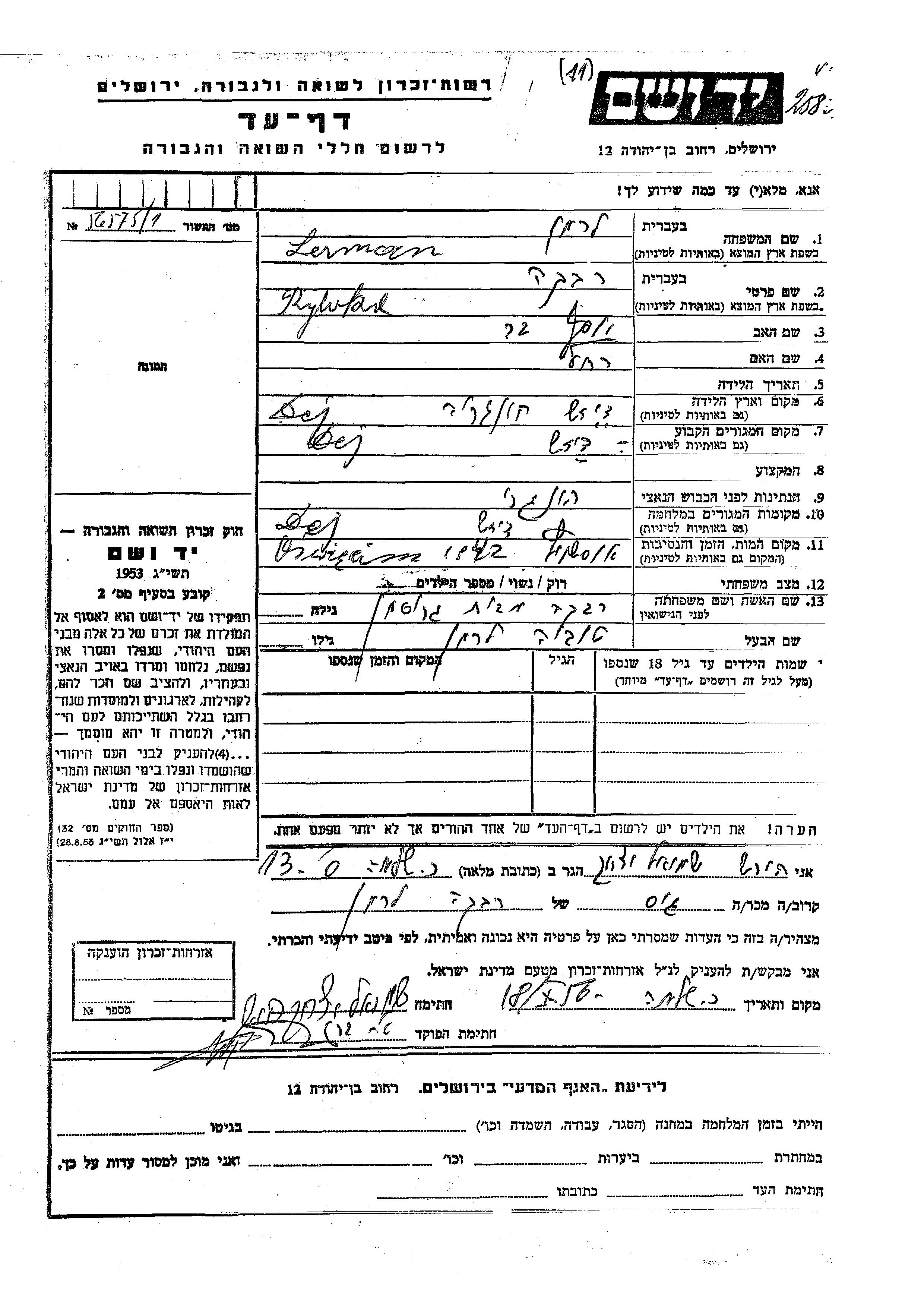 Rywka Lerman, geb. Grisman wurde in Dej, Rumänien geboren. Sie war die Tochter von Yosef Ber und Rakhel. Sie war mit Tuvia Verheiratet. Vor dem Zweiten Weltkrieg lebte sie in Dej, Rumänien. Während des Krieges war sie in Dej, Rumänien.