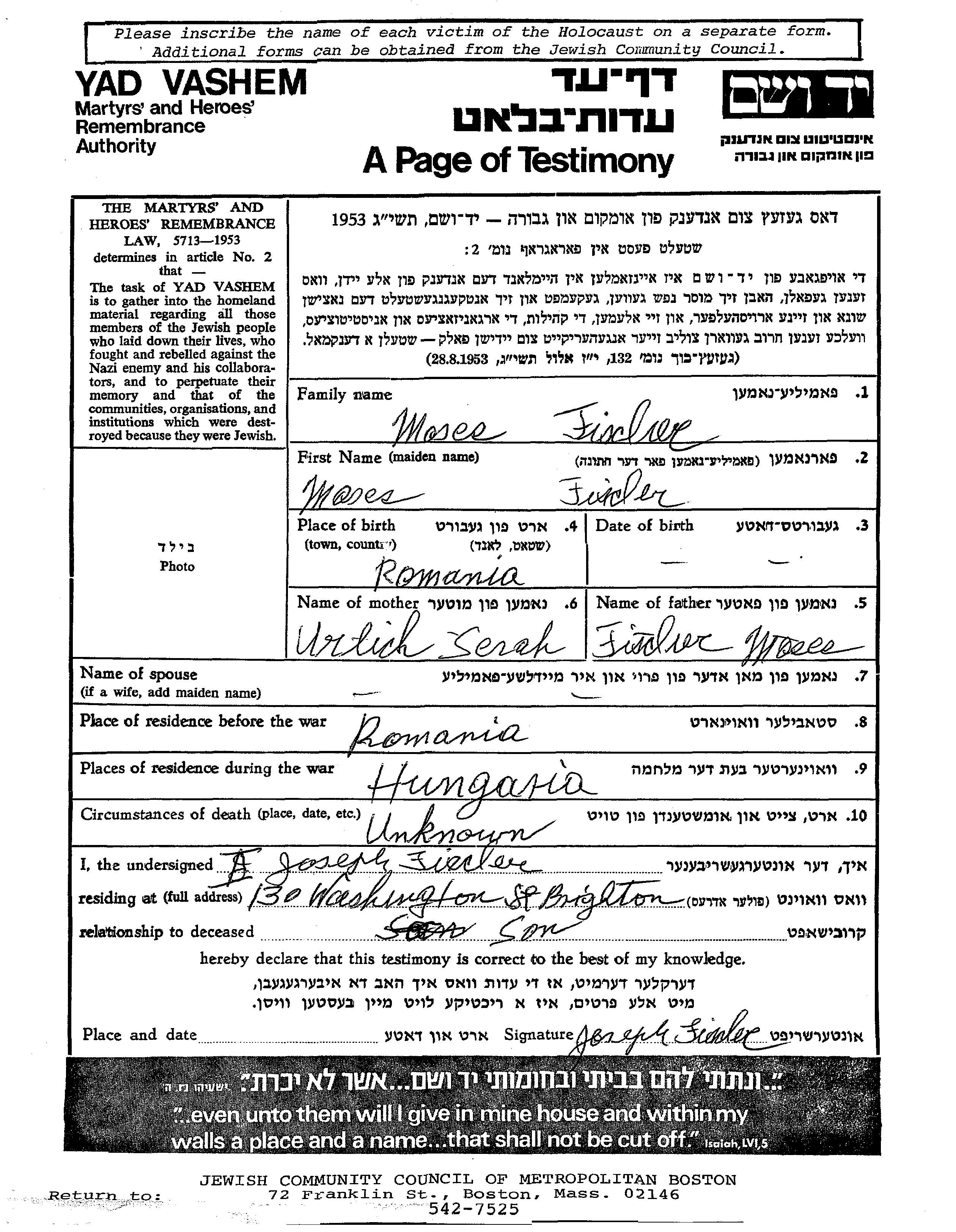 Moses Fixler wurde in Rumänien geboren. Er war der Sohn von Moses und Sarah. Vor dem Zweiten Weltkrieg lebte er in Rumänien. Während des Krieges war er in Ungarn.