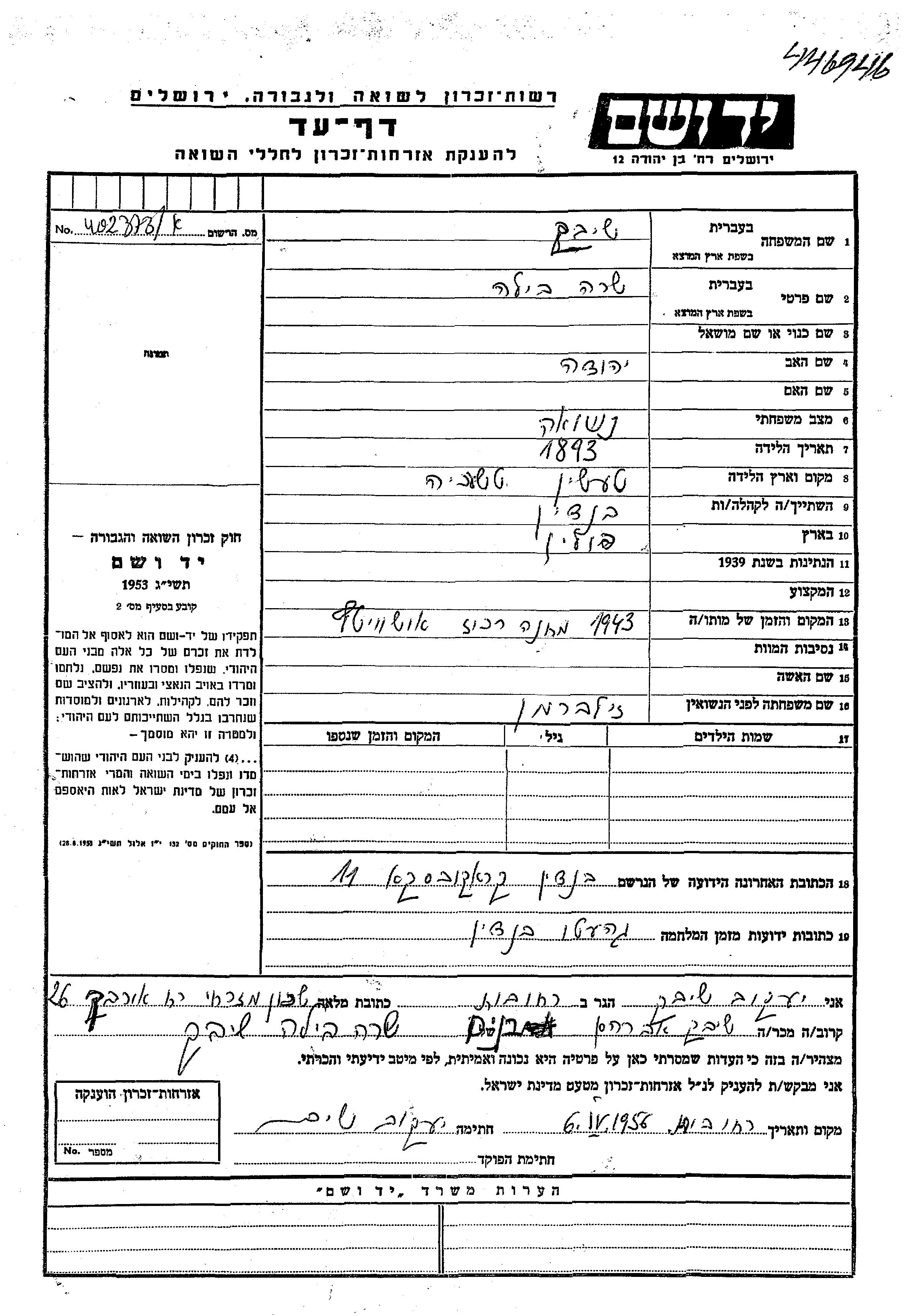 Sara Bila wurde in der Schoah ermordet. Todesort: Auschwitz, Polen im Jahr 1943.