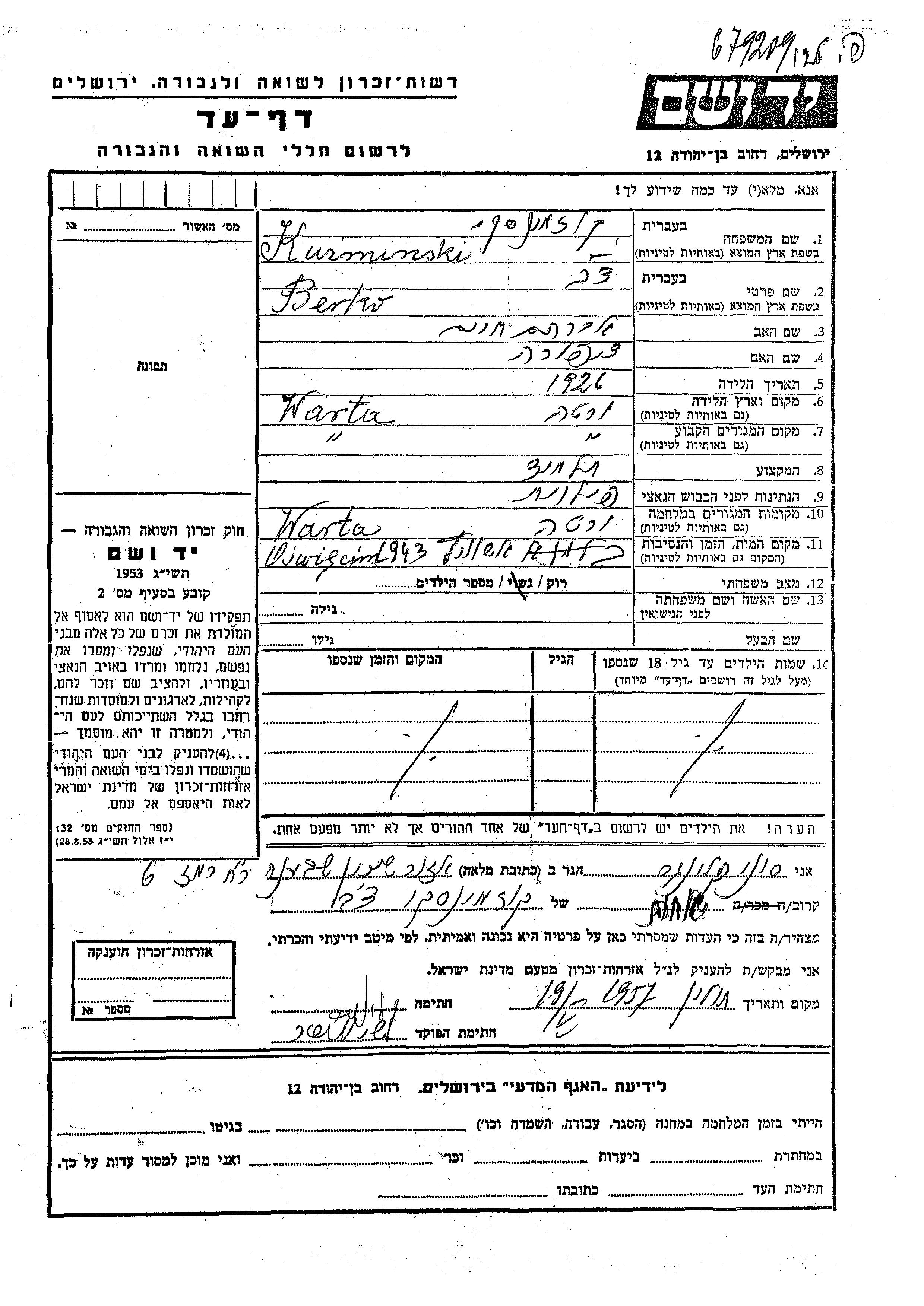 Kuzminski Berko Dov 1926 Warta, Polen Gedenkblatt