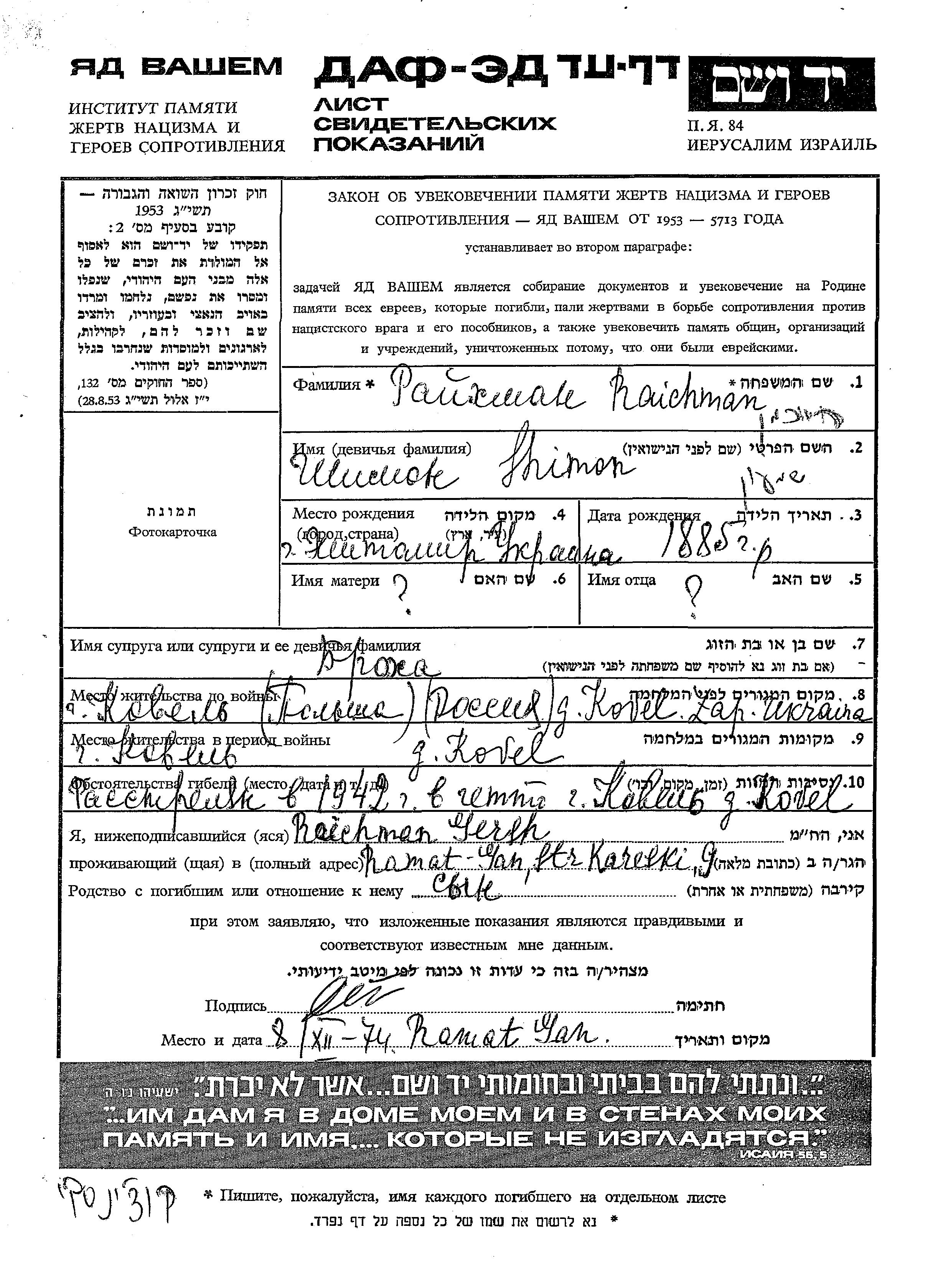 Shimon Raichman wurde im Jahr 1885 in Zhitomir, Ukraine (UdSSR) geboren. Vor dem Zweiten Weltkrieg lebte er in Kovel, Polen. Während des Krieges war er in Kovel, Polen.
