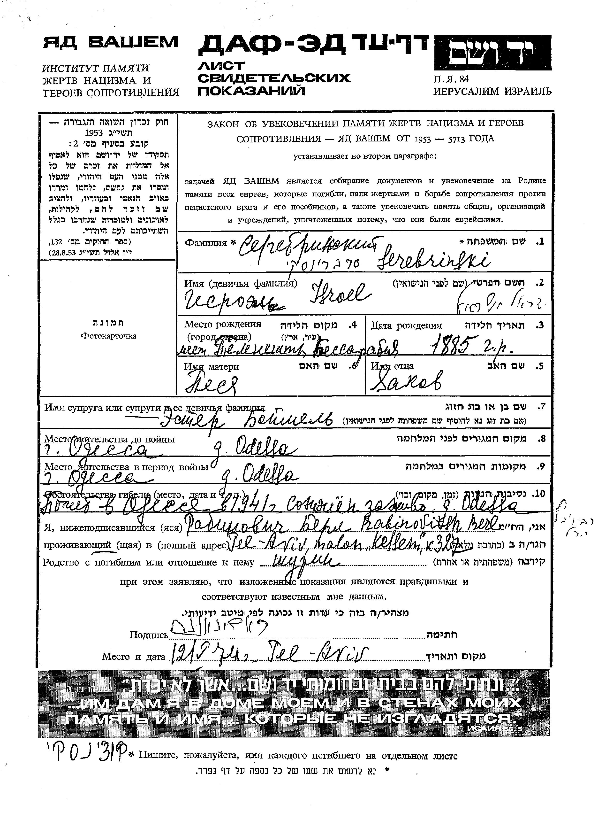 Isroel Serebrinski wurde im Jahr 1885 in Teleneshty, Rumänien geboren. Er war der Sohn von Yaakov und Pesya. Vor dem Zweiten Weltkrieg lebte er in Odessa, Ukraine (UdSSR). Während des Krieges war er in Odessa, Ukraine (UdSSR).