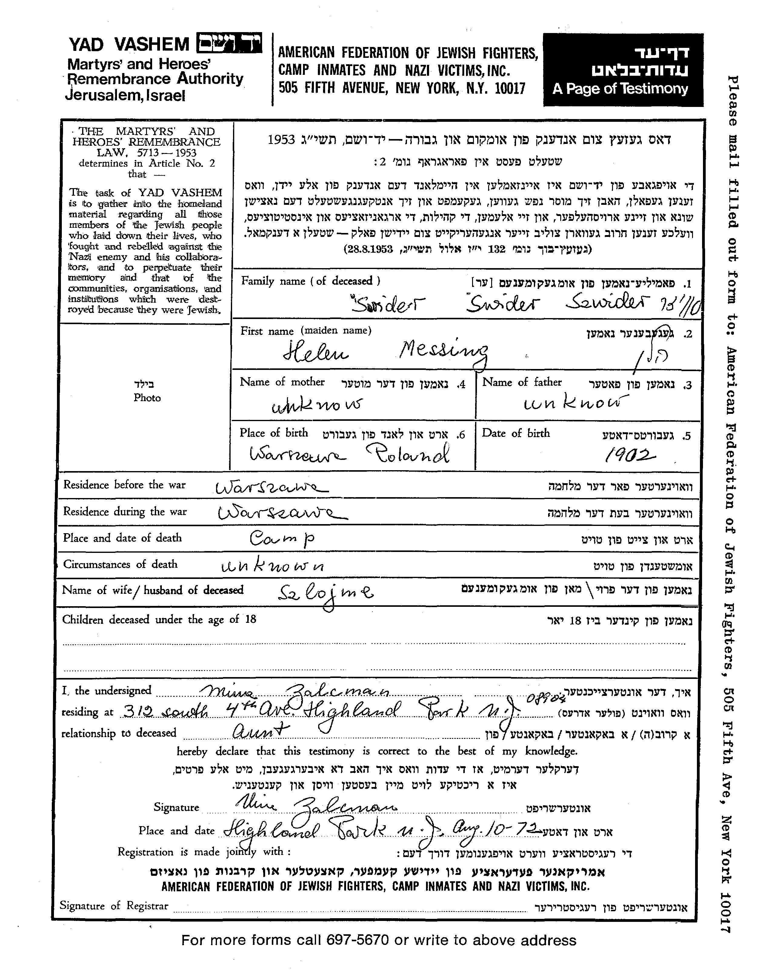 Helen Swider, geb. Messing wurde im Jahr 1902 in Warsaw, Polen geboren. Sie war mit Szlojme Verheiratet. Vor dem Zweiten Weltkrieg lebte sie in Warsaw, Polen. Während des Krieges war sie in Warsaw, Polen.