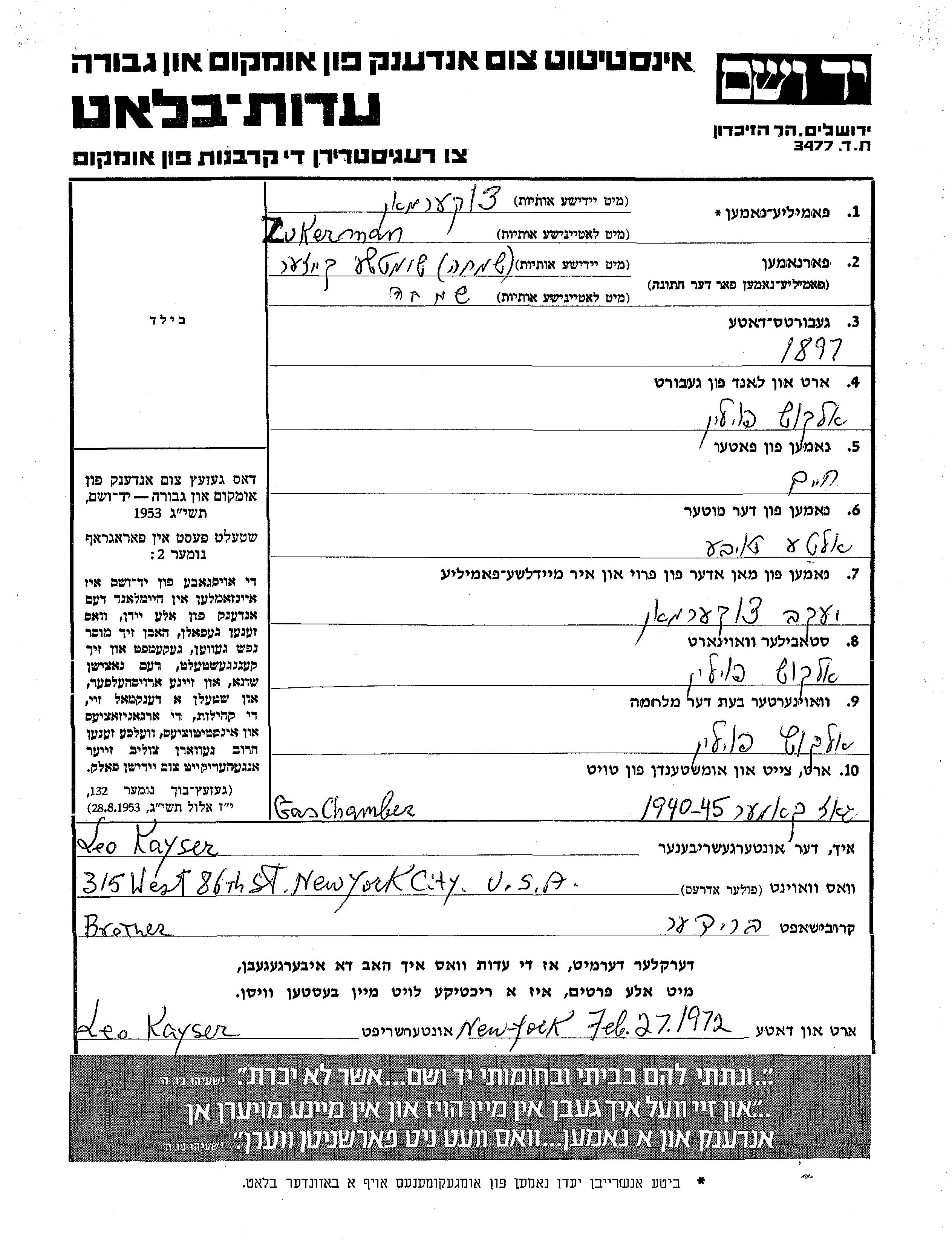 Zukerman Simkha 1897 Olkush, Polen Gedenkblatt