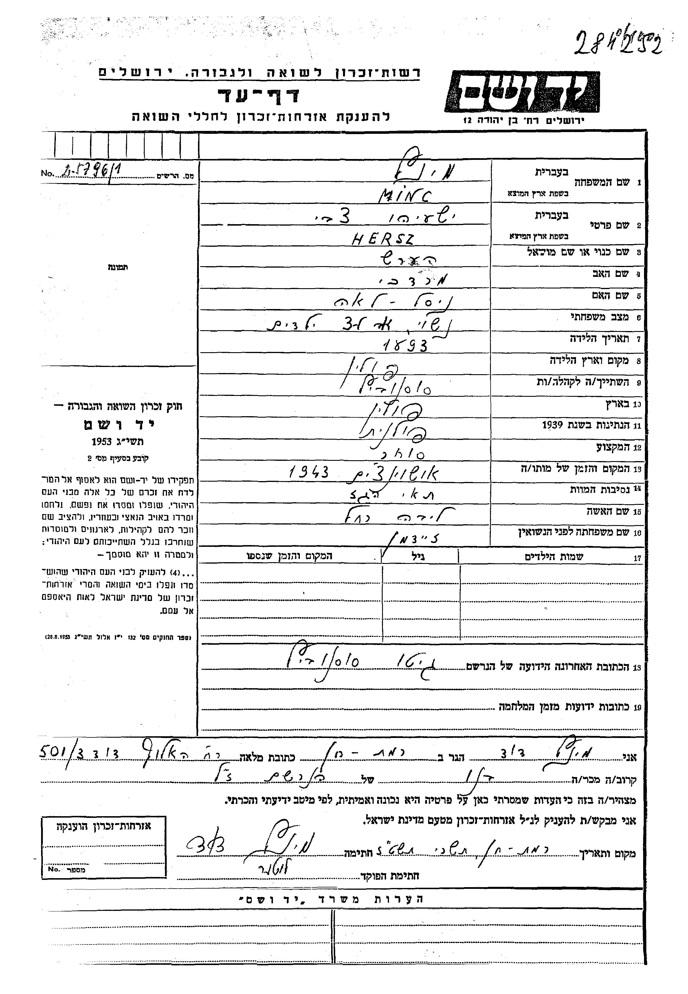 Hersz Yeshayahu Tzvi Minc wurde im Jahr 1893 in Polen geboren. Er war der Sohn von Mordekhai und Nisel Lea. Er war Kaufmann/-frau und mit Liba Rakhel, geb. Zeidman Verheiratet. Vor dem Zweiten Weltkrieg lebte er in Sosnowic, Polen.