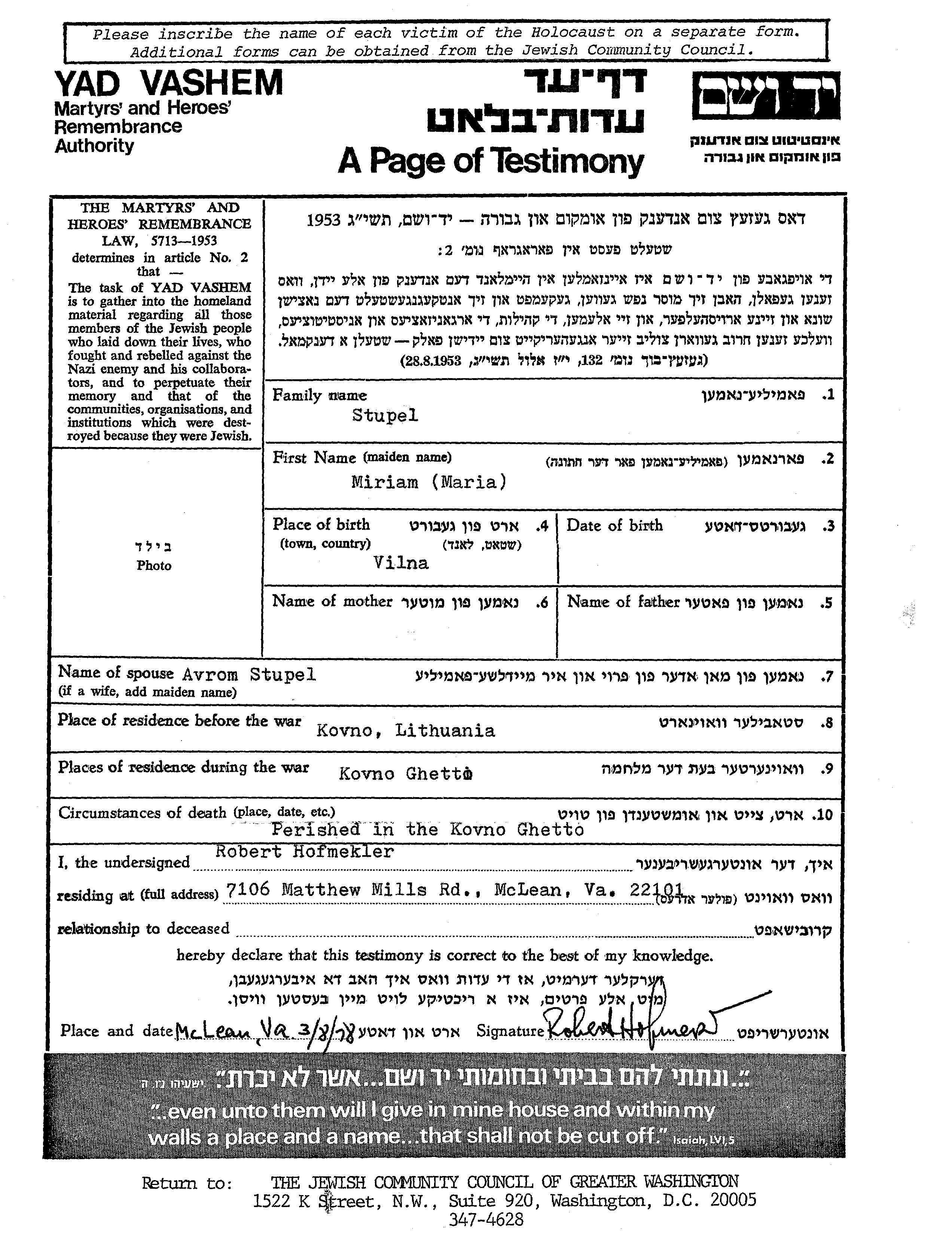 Stupel Miriam Maria Kovno, Litauen Gedenkblatt