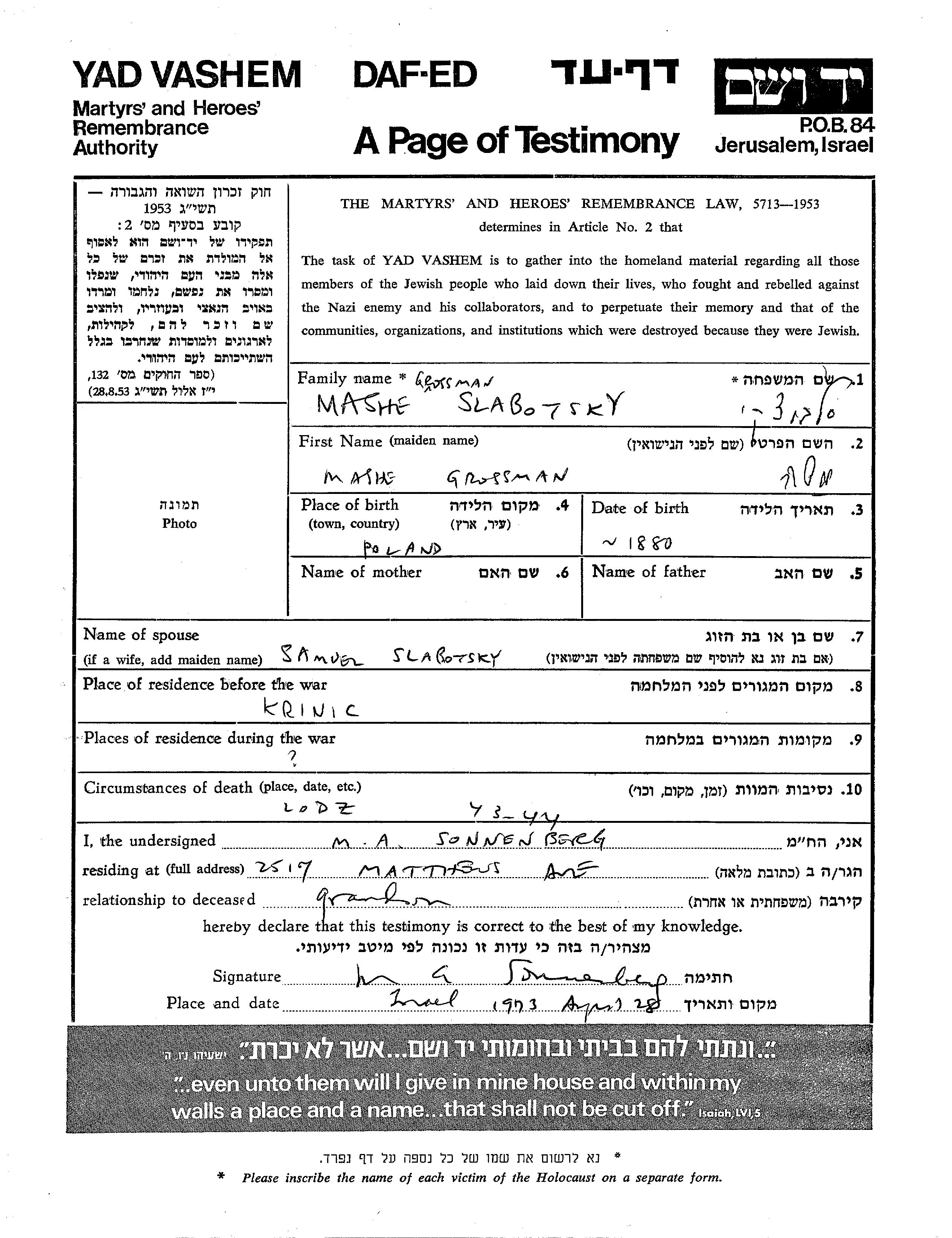 Mashe Moshe Slabotsky Slavutzki, geb. Grossman wurde im Jahr 1880 in Polen geboren. Sie war mit Samuel Verheiratet. Vor dem Zweiten Weltkrieg lebte sie in Krinic, Polen.