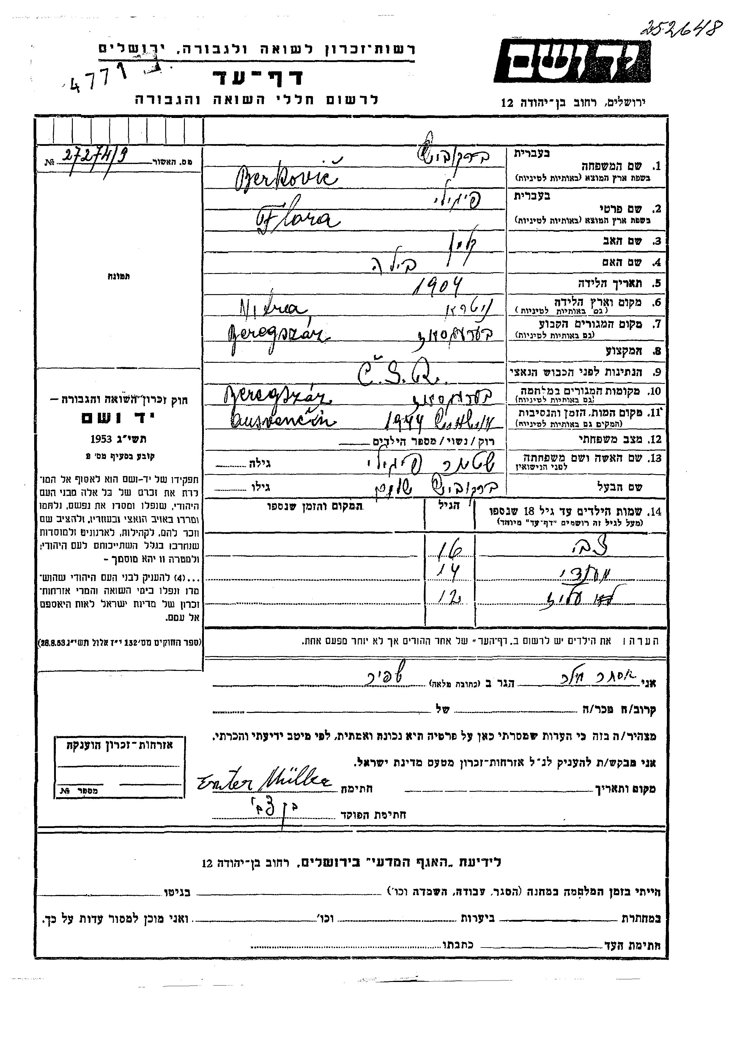Flora Feigali Berkovici, geb. Shteiner wurde im Jahr 1904 in Nitra, Tschechoslowakei geboren. Sie war die Tochter von Kalman und Bila. Sie war mit Shalom Verheiratet. Vor dem Zweiten Weltkrieg lebte sie in Beregszasz, Tschechoslowakei. Während des Krieges war sie in Beregszasz, Tschechoslowakei.