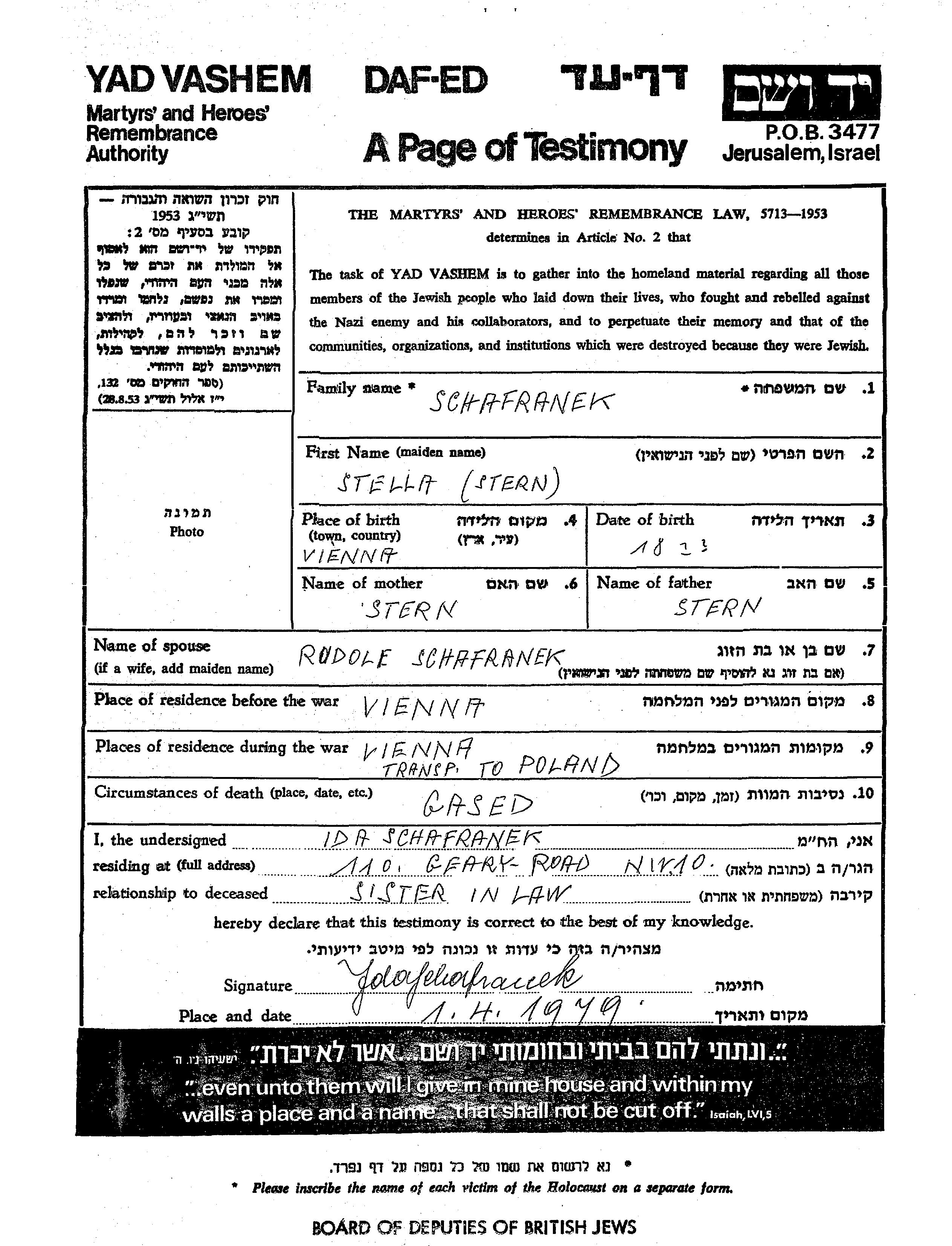 Stella Schafranek, geb. Stern wurde in Vienna, Österreich geboren. Vor dem Zweiten Weltkrieg lebte sie in Vienna, Österreich. Während des Krieges war sie in Vienna, Österreich.