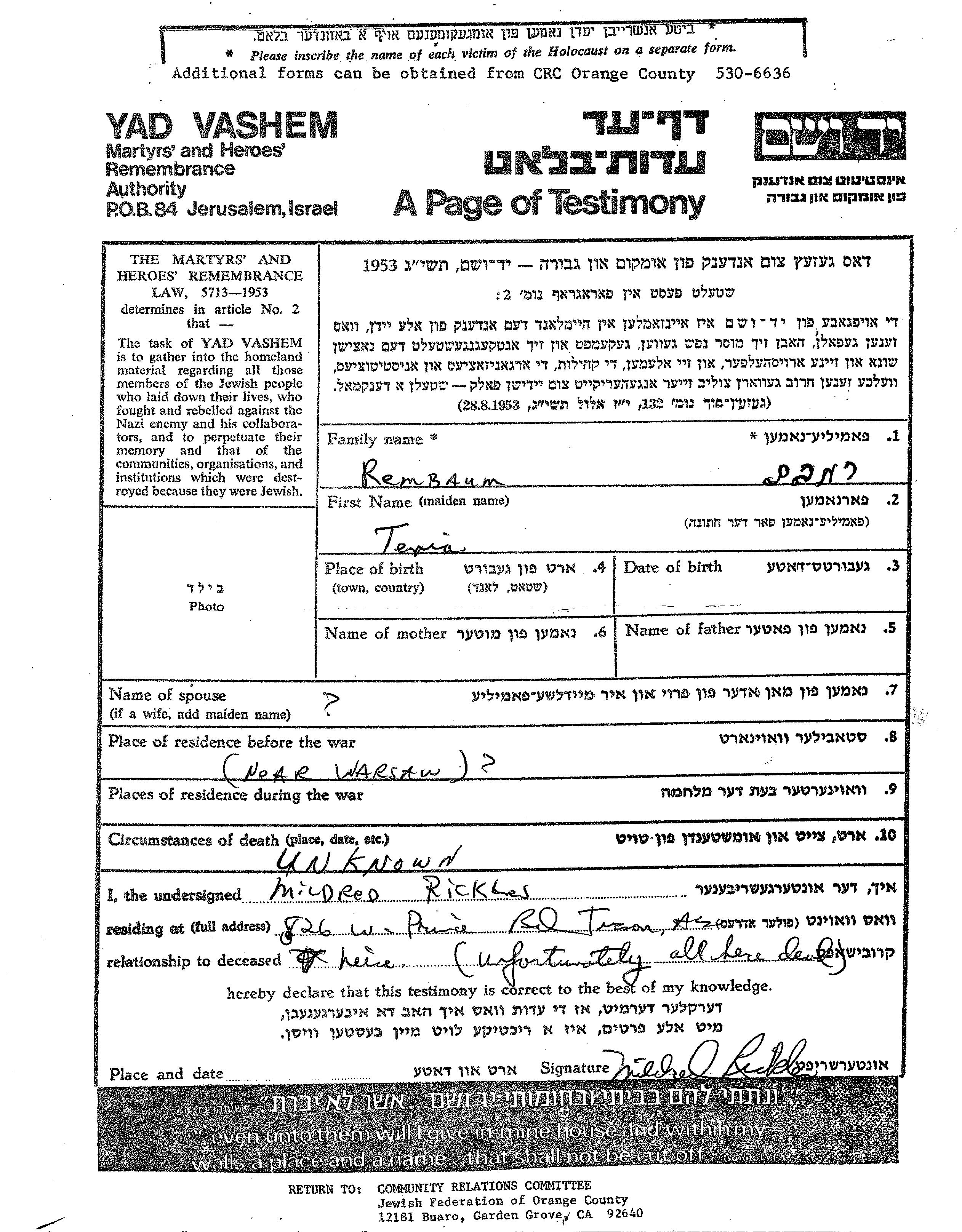 Rembaum Rambam Tania Warsaw, Polen Gedenkblatt