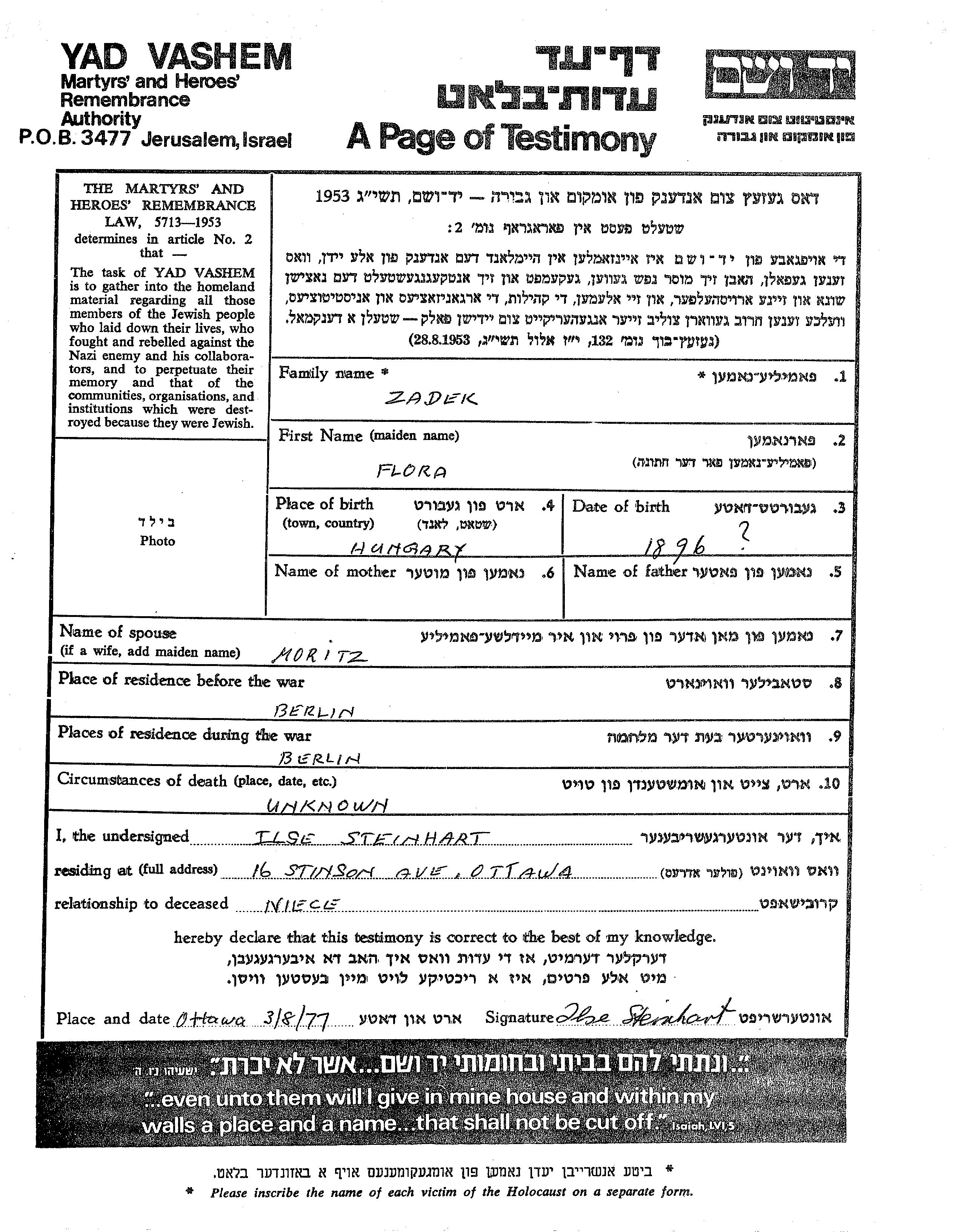 Flora Zadek wurde im Jahr 1896 in Ungarn geboren. Vor dem Zweiten Weltkrieg lebte sie in Berlin, Deutsches Reich. Während des Krieges war sie in Berlin, Deutsches Reich.