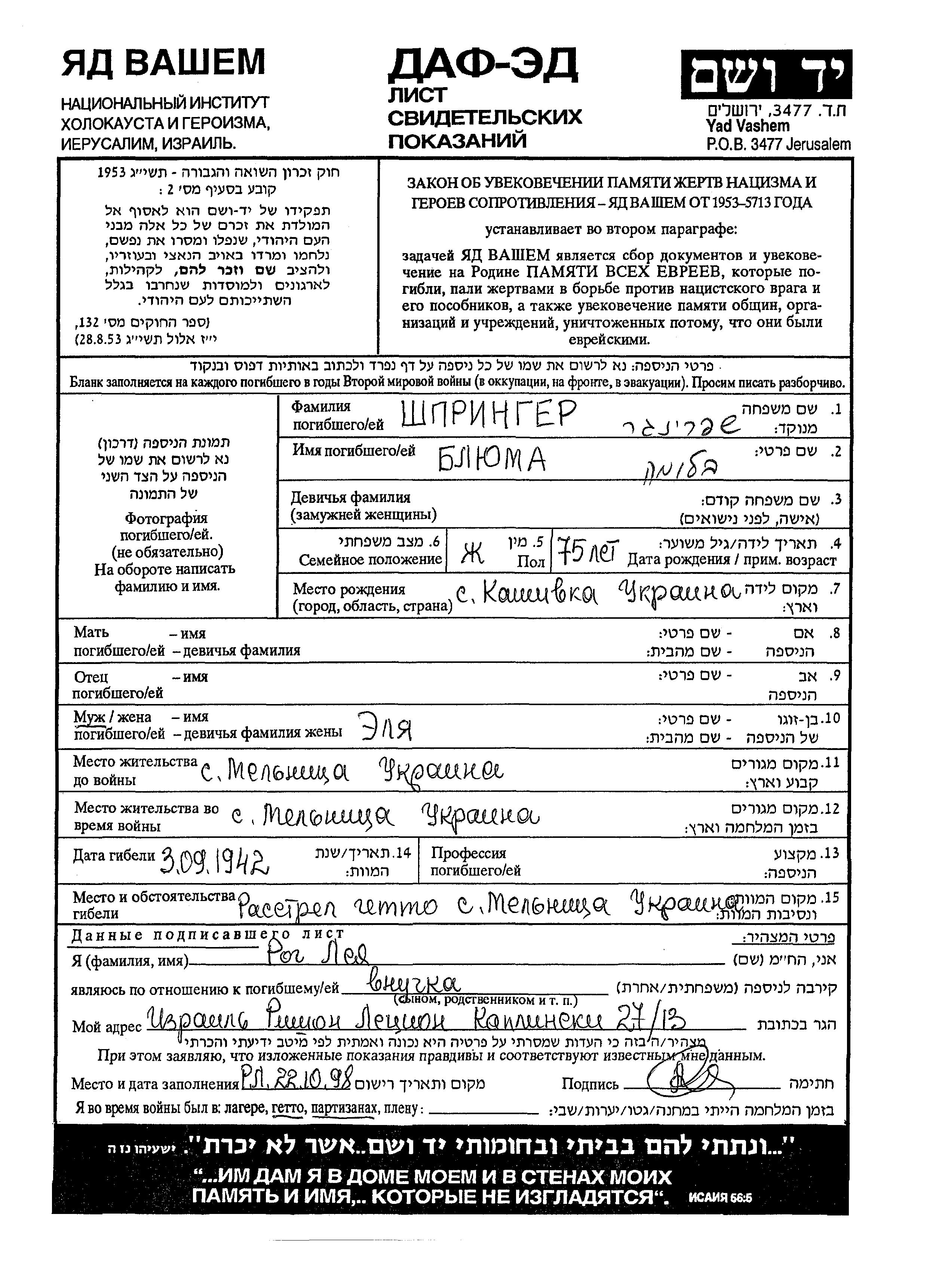 Shpringer Bluma Mielnica, Polen Gedenkblatt