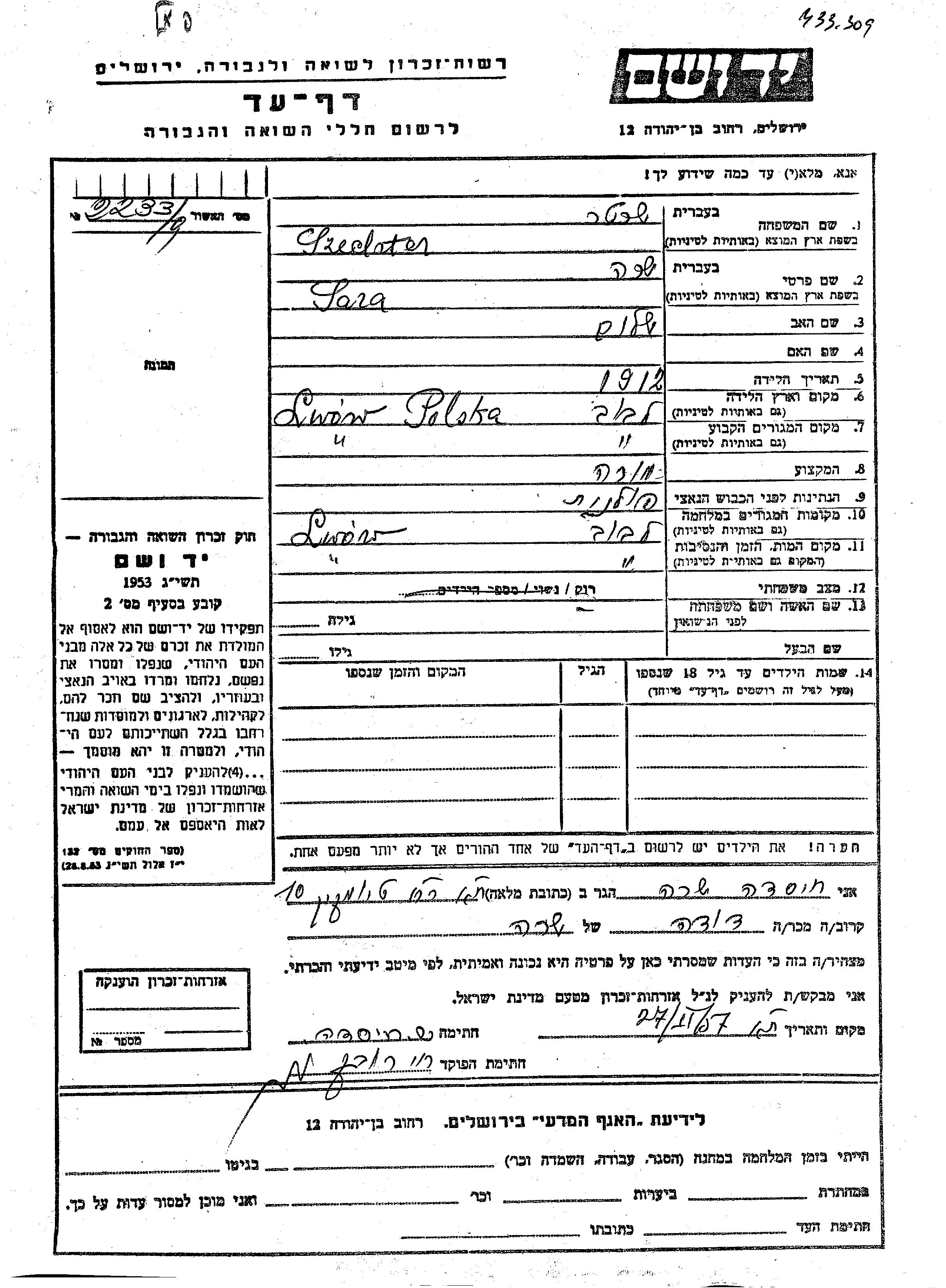 Sara Szechter wurde im Jahr 1912 in Lwow, Polen geboren. Sie war die Tochter von Shalom. Sie war Lehrer/in und Ledig. Vor dem Zweiten Weltkrieg lebte sie in Lwow, Polen. Während des Krieges war sie in Lwow, Polen.
