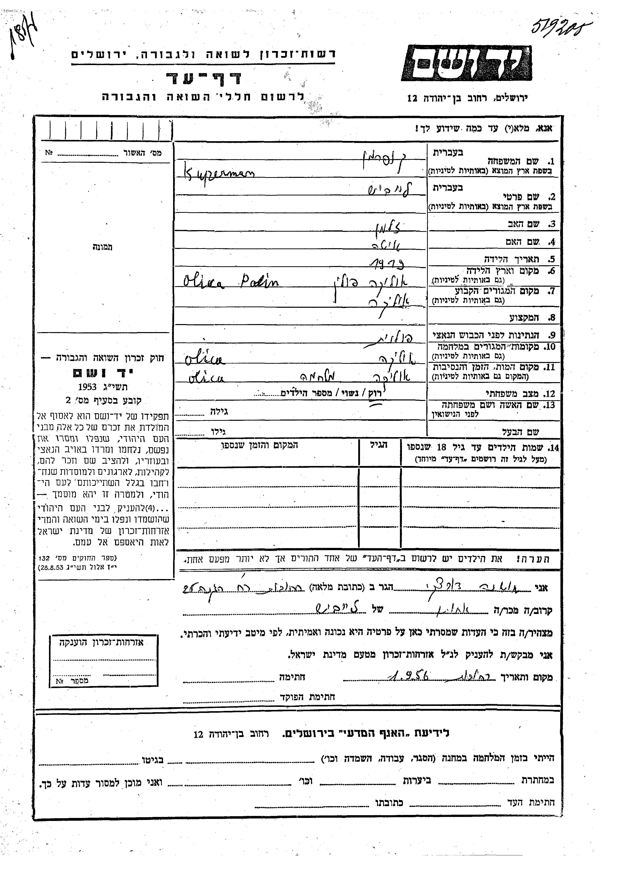 Leibish Kuperman wurde im Jahr 1919 in Ołyka, Polen geboren. Er war der Sohn von Zalman und Ita. Er war Ledig. Vor dem Zweiten Weltkrieg lebte er in Ołyka, Polen. Während des Krieges war er in Ołyka, Polen.