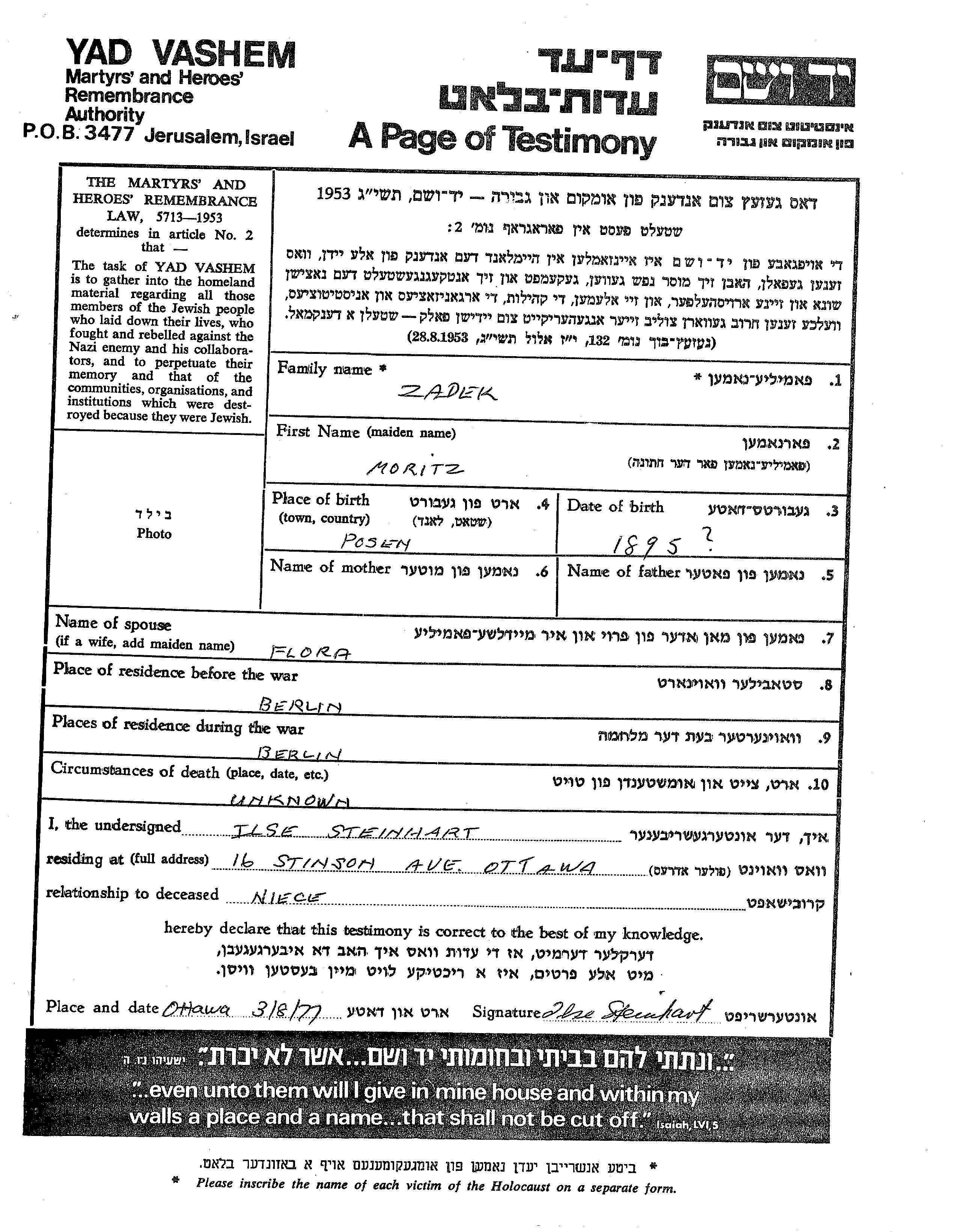 Moritz Zadek wurde im Jahr 1895 in Posen, Polen geboren. Er war mit Flora Verheiratet. Vor dem Zweiten Weltkrieg lebte er in Berlin, Deutsches Reich. Während des Krieges war er in Berlin, Deutsches Reich.