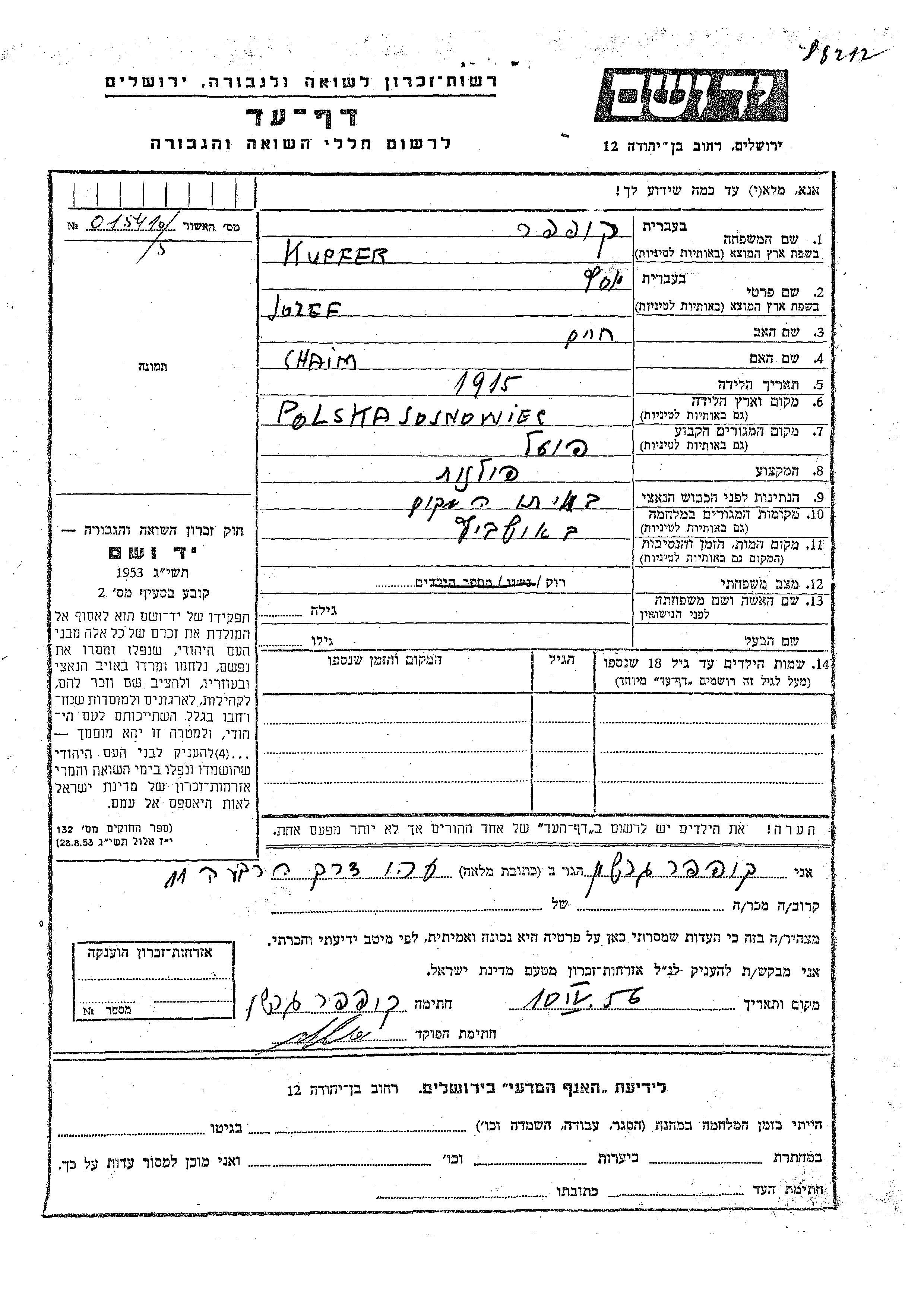 Kupfer Josef 1915 Sosnowiec, Polen Gedenkblatt