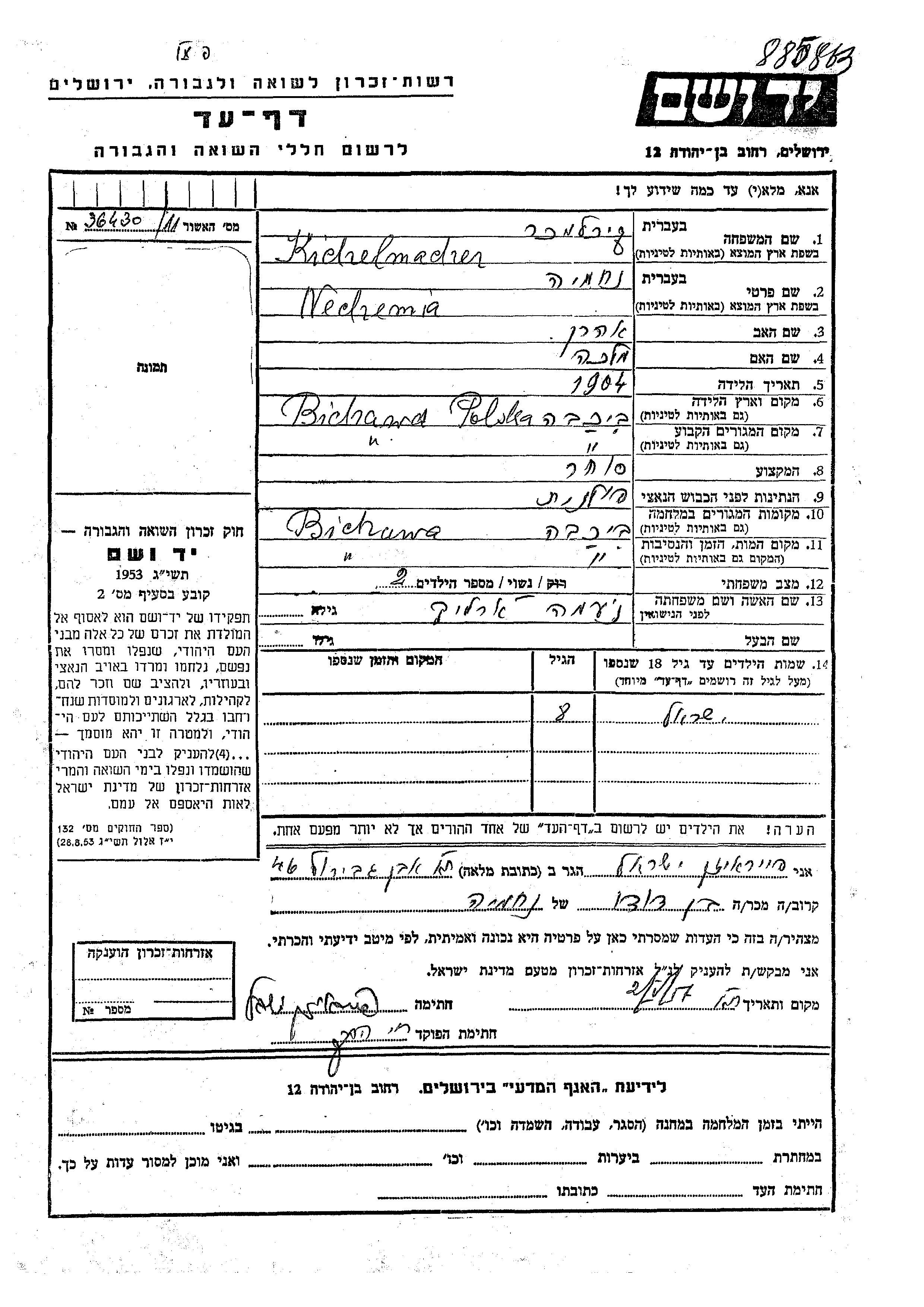 Nechemia Kichelmacher wurde im Jahr 1904 in Bychawa, Polen geboren. Er war der Sohn von Aharon und Malka. Er war Kaufmann/-frau und mit Naama, geb. Erlikh Verheiratet. Vor dem Zweiten Weltkrieg lebte er in Bychawa, Polen. Während des Krieges war er in Bichawa, Polen.