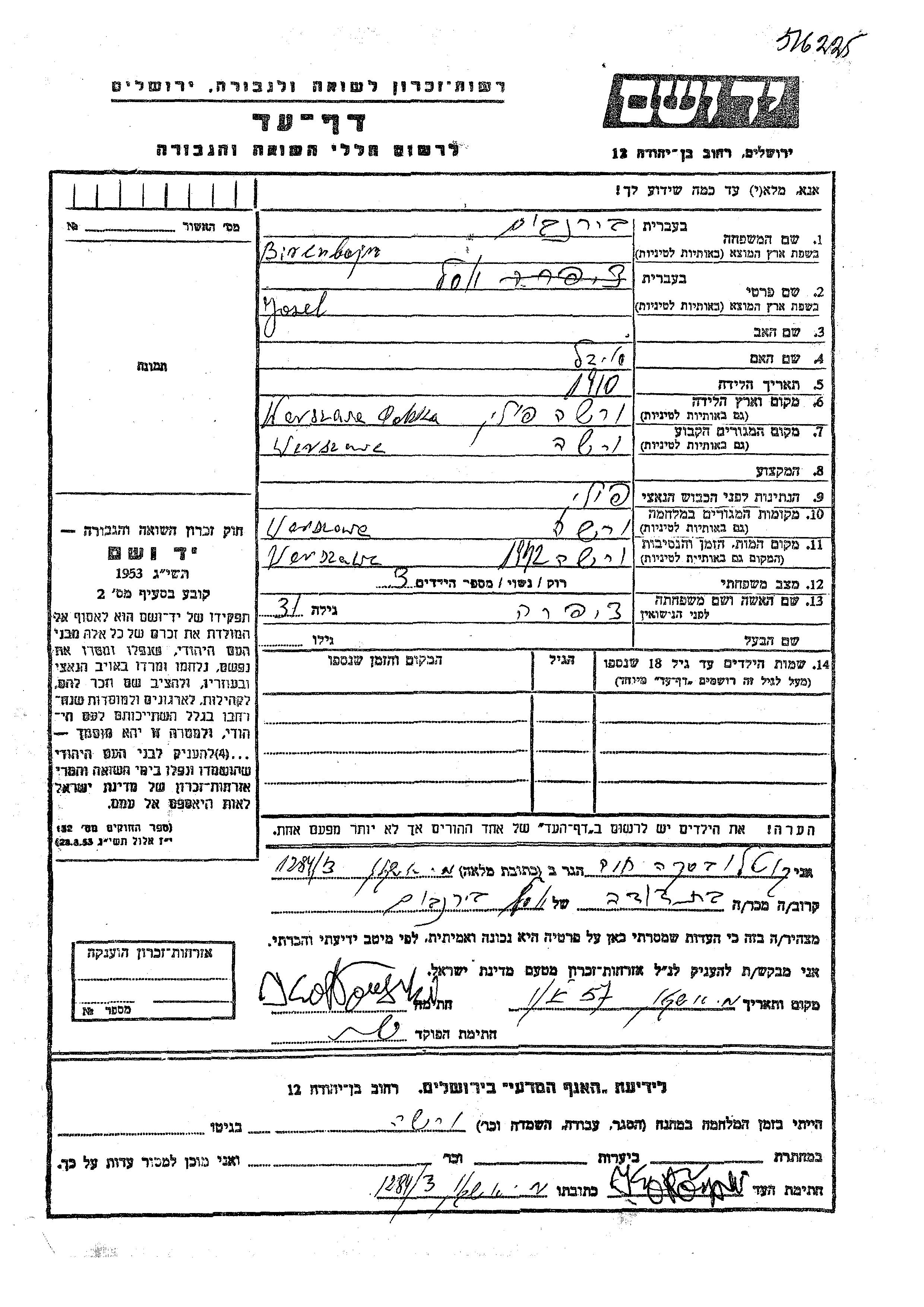 Yosel Birenbojm wurde im Jahr 1910 in Warszawa, Polen geboren. Er war der Sohn von Idl. Er war mit Tzipora Verheiratet. Vor dem Zweiten Weltkrieg lebte er in Warszawa, Polen. Während des Krieges war er in Warszawa, Polen.